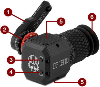 - Not visible. Shown with the DSMC2 RED EVF Mount attached.