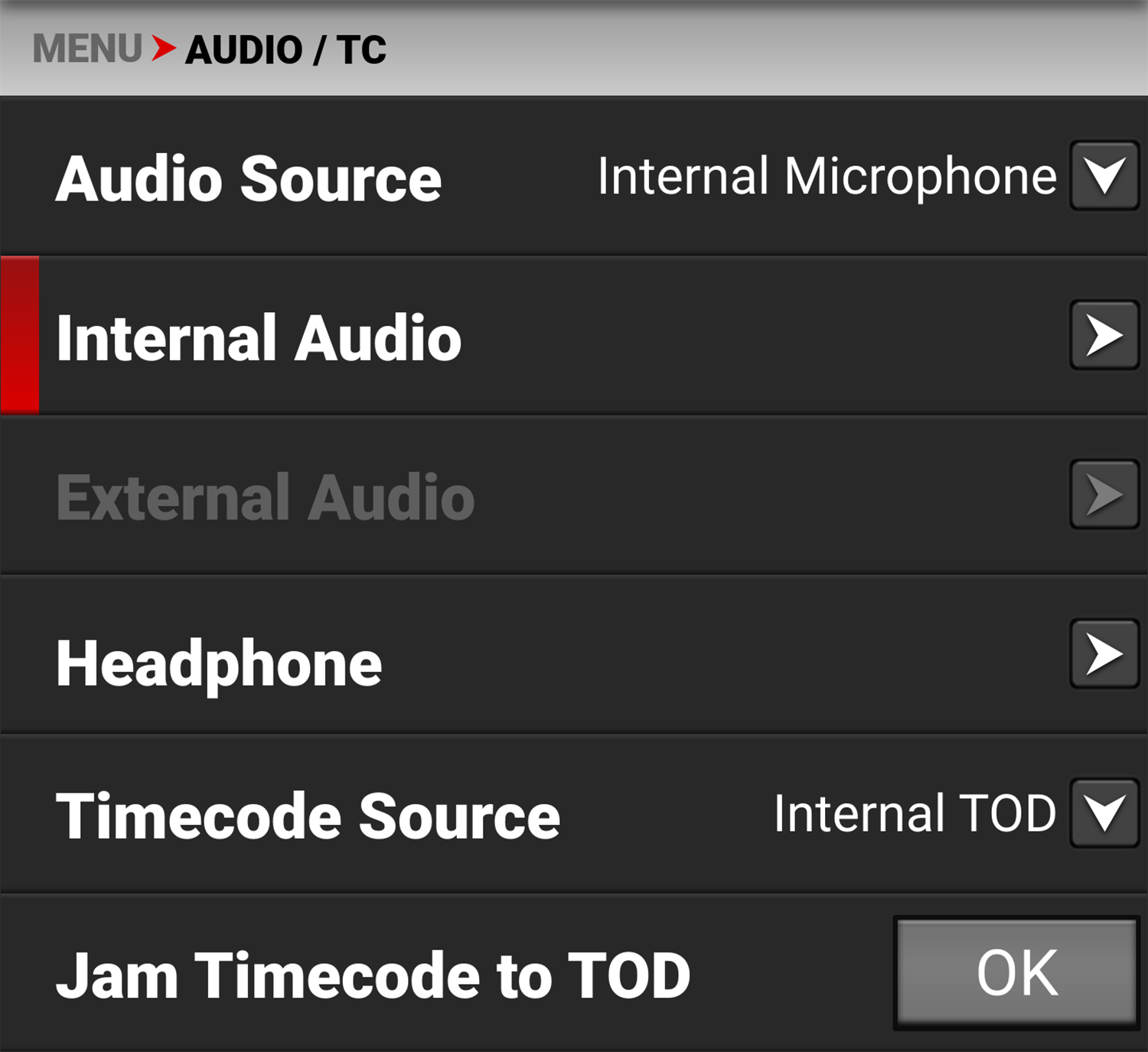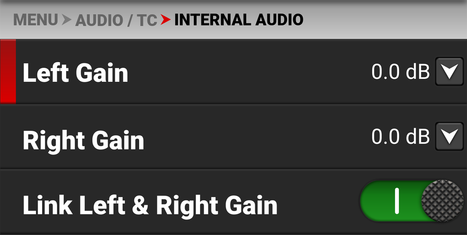 Use the Internal Audio settings to set the left and right internal audio levels. This menu is only enabled when the Audio Source is set to Internal Microphone.