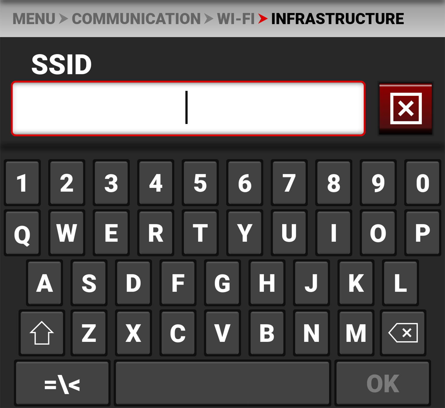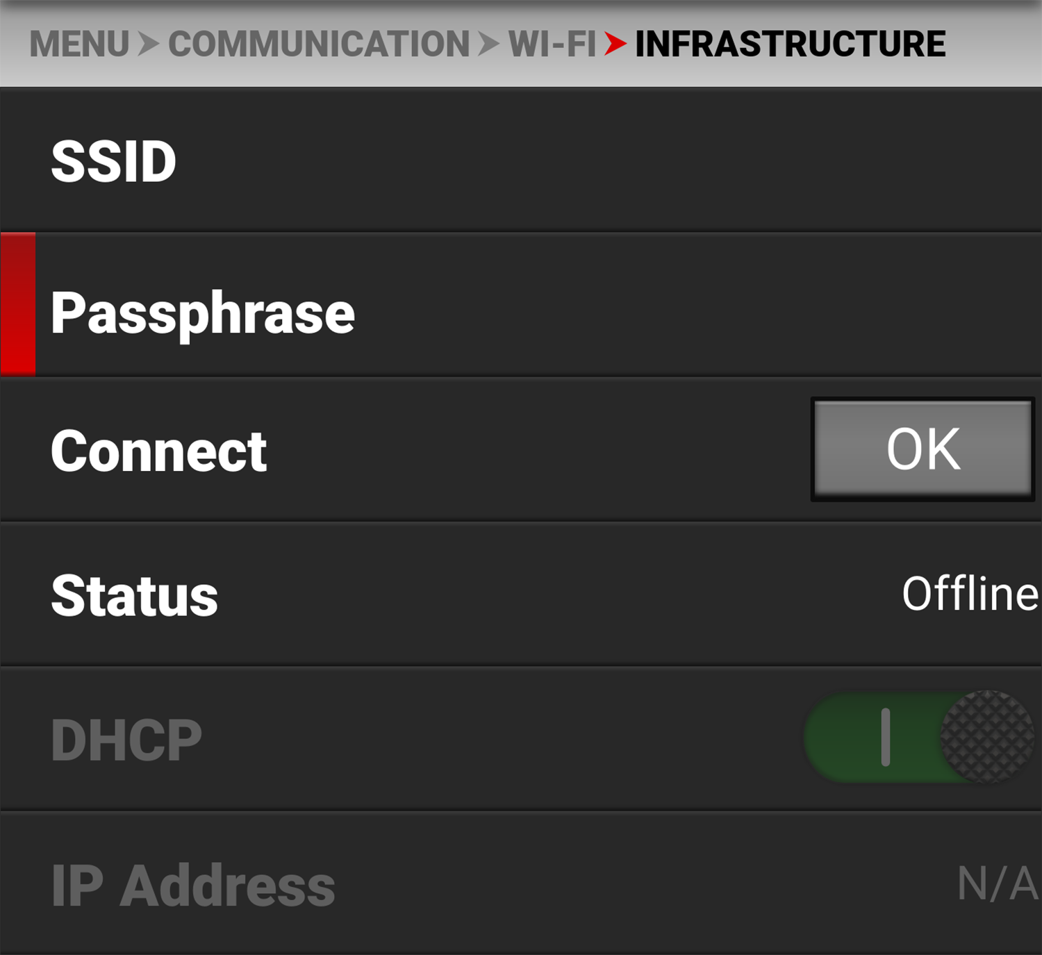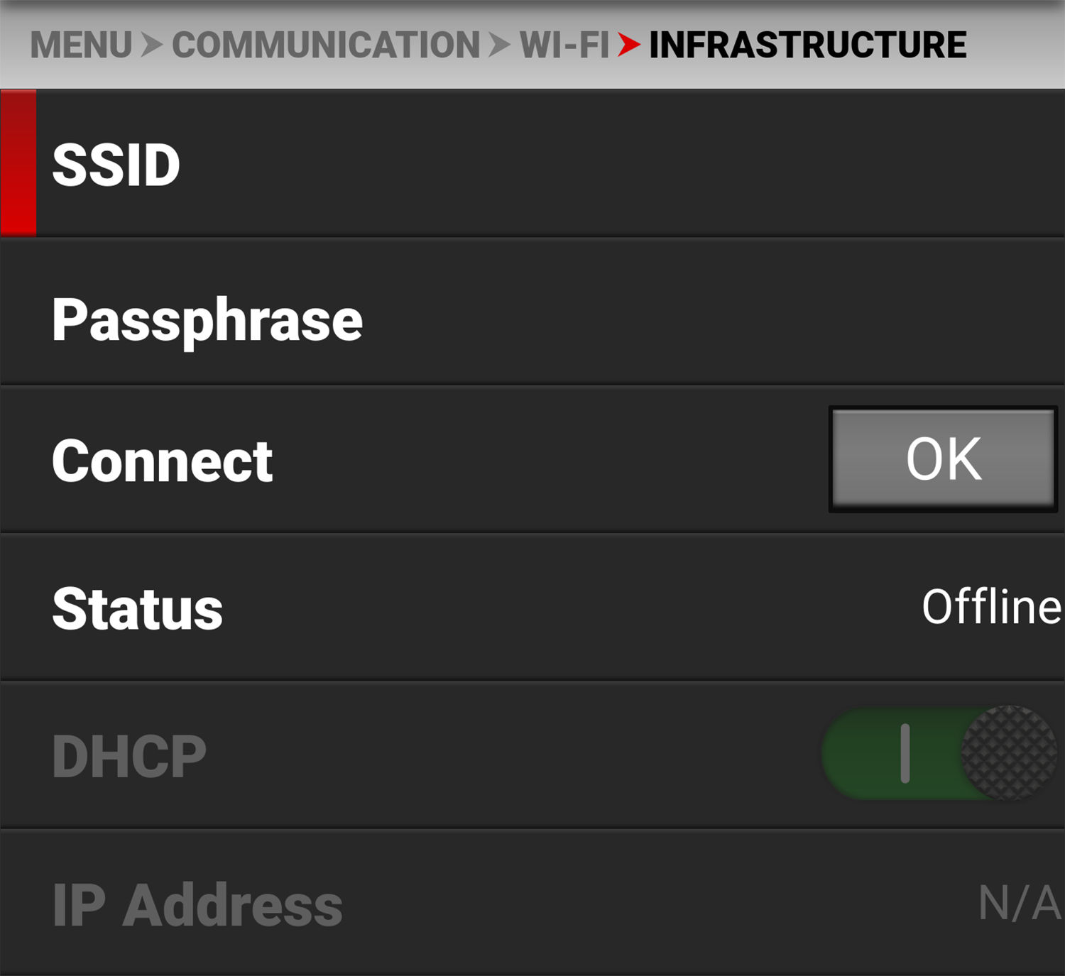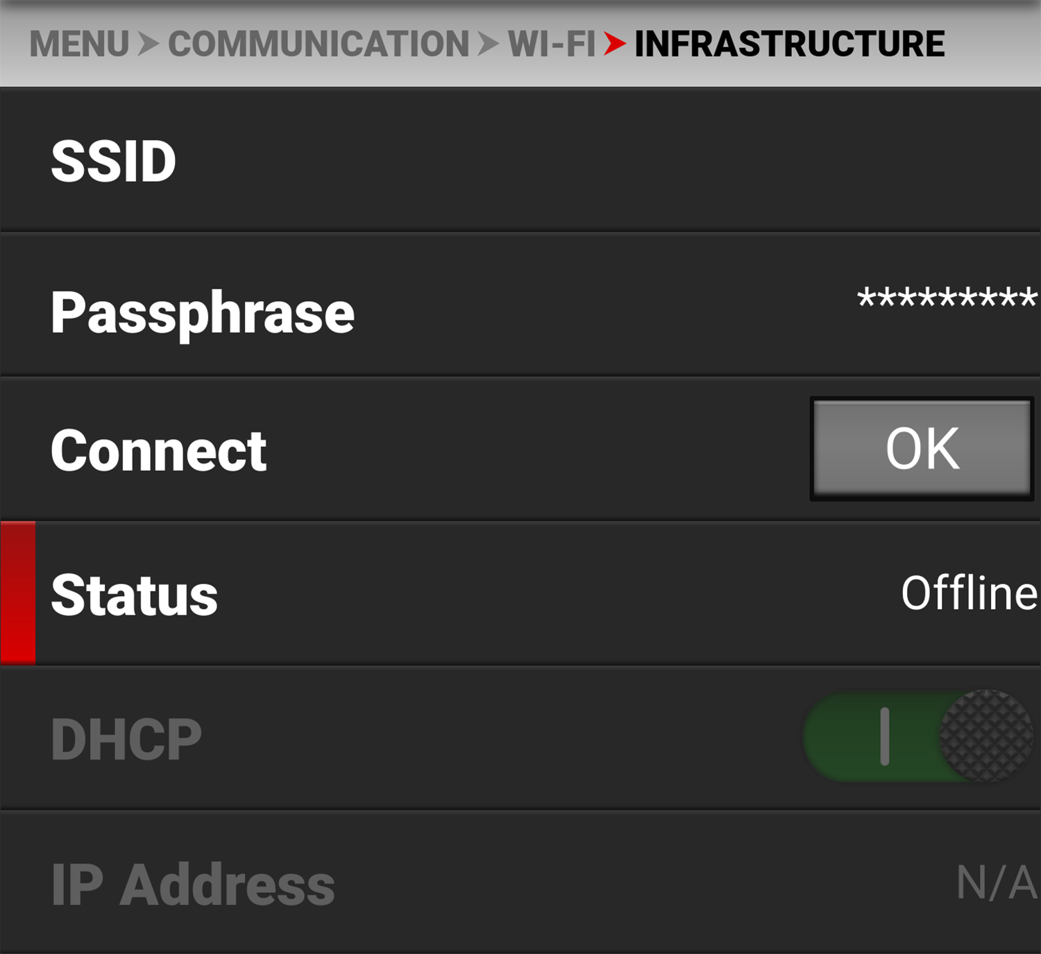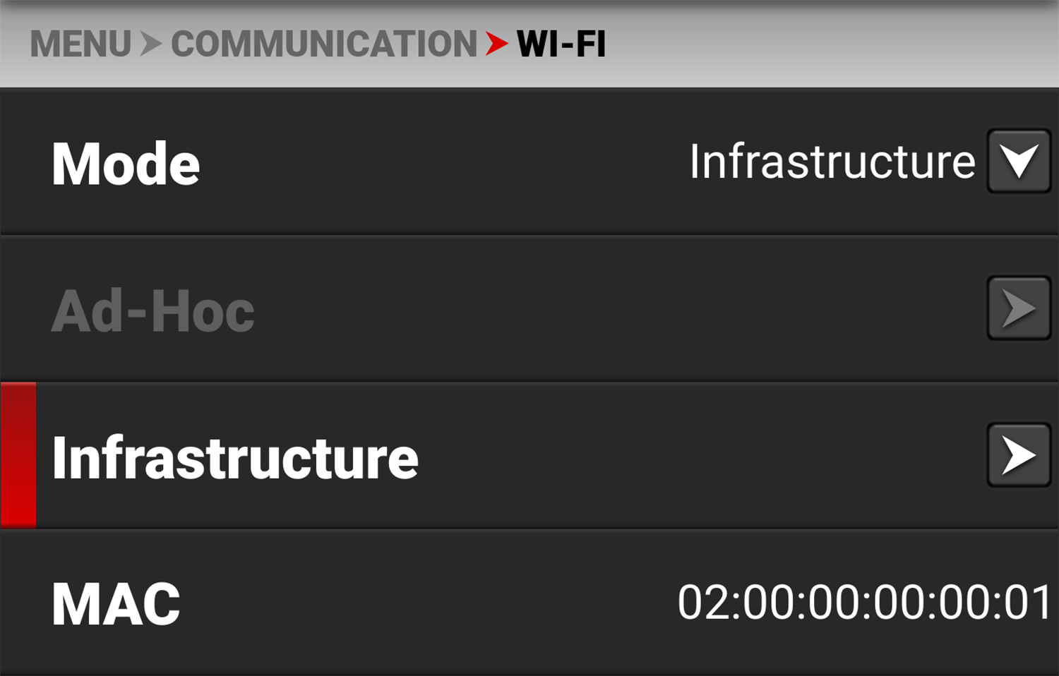 Use the Infrastructure menu to configure the Wi-Fi settings to connect to an existing Wi-Fi infrastructure: