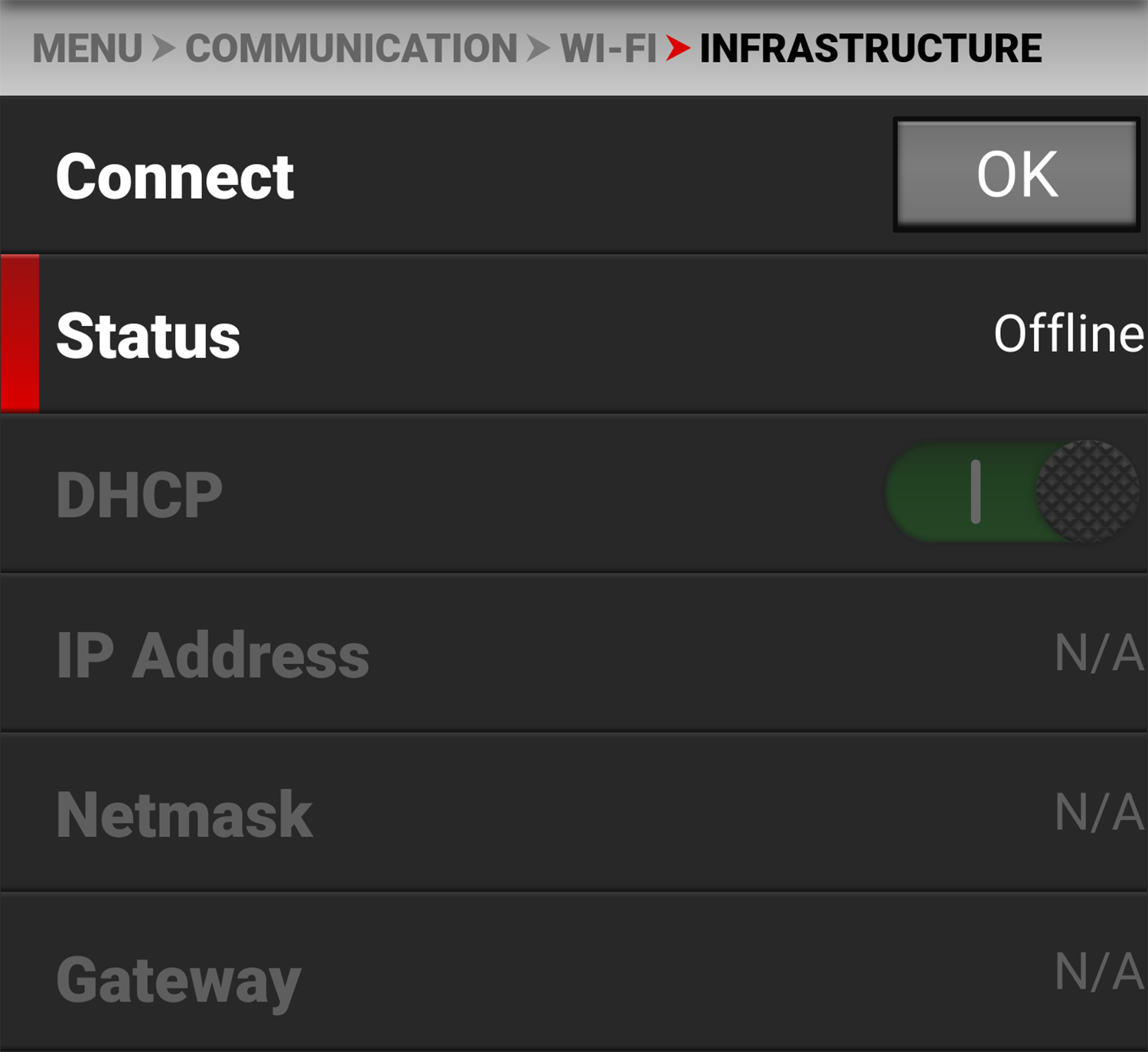 NOTE: The Infrastructure menu is enabled when the Wi-Fi Mode is set to Infrastructure. Refer to the Wi-Fi section for more information.