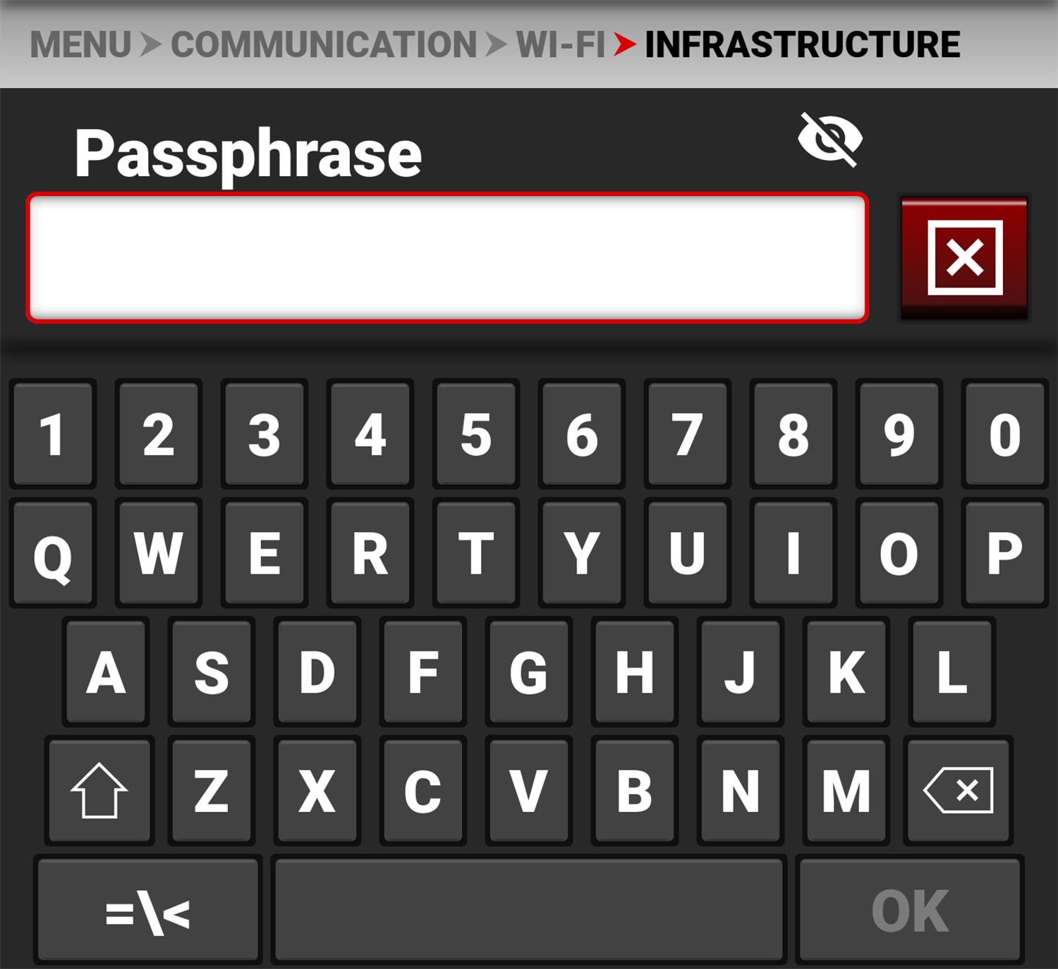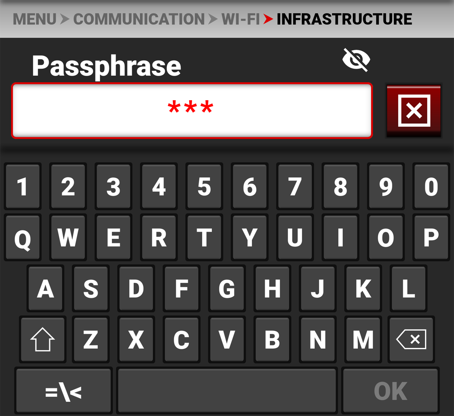 Use the keypad to enter the Wi-Fi infrastructure password. Use the Eye icon to hide the characters or make them visible.