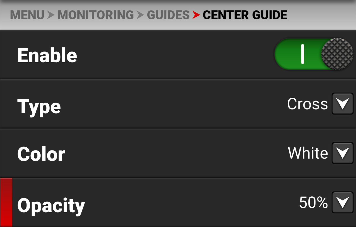 Use Opacity to select how transparent the Center Guide appears.