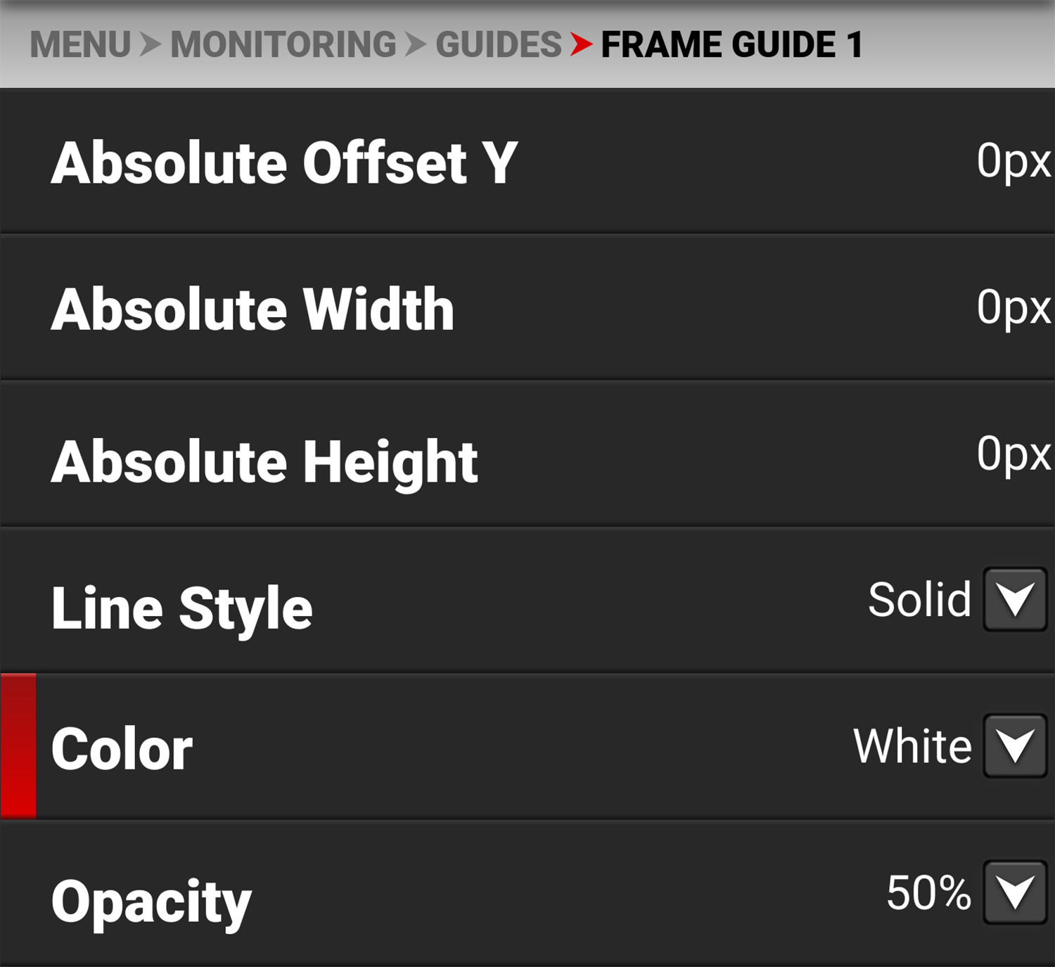 Use Opacity to select how transparent the Frame Guide line appears.