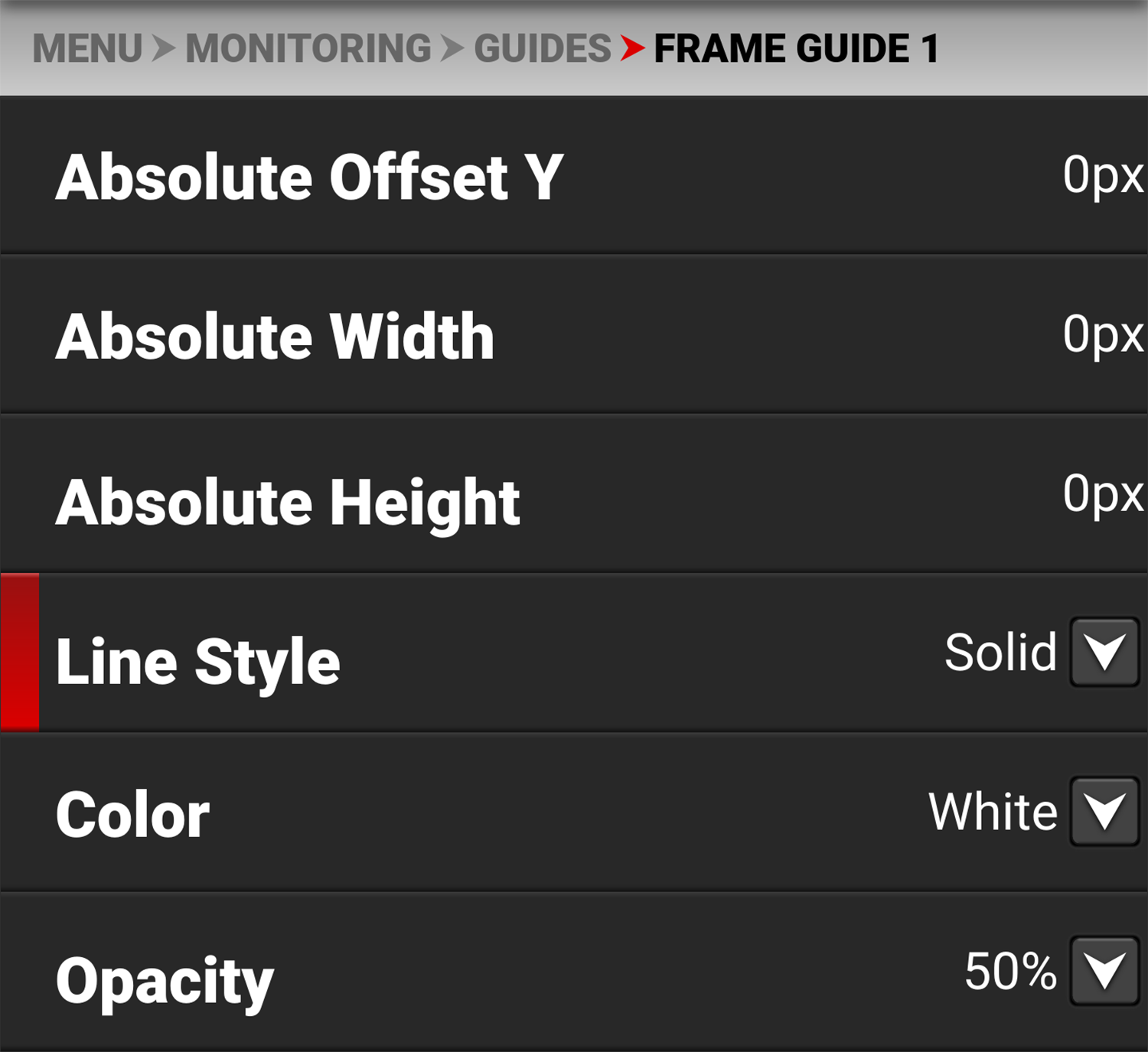 Select the Frame Guide line opacity |