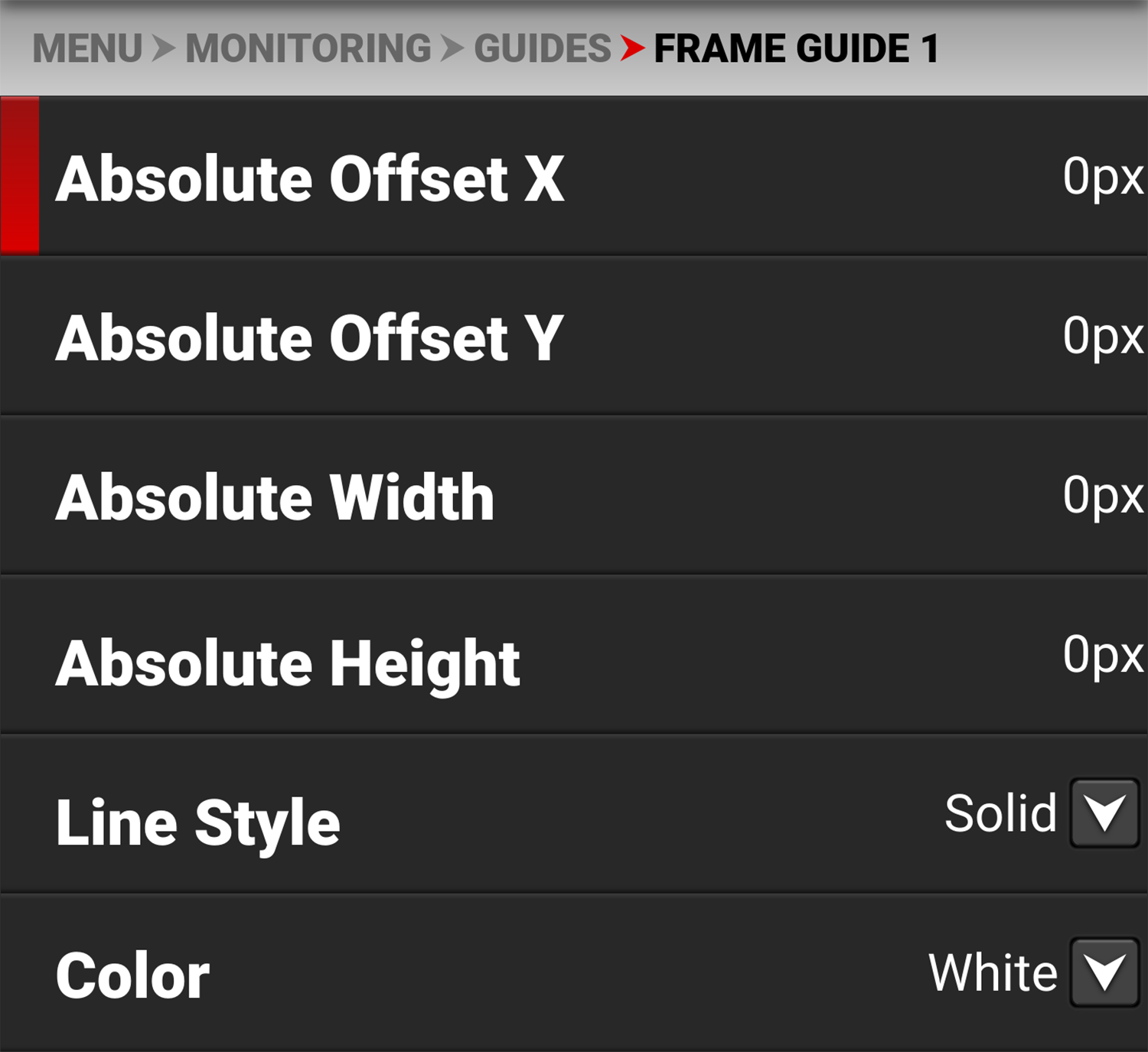 Use the keypad to enter the number of pixels for X/Y offset and for the width and height of the Frame Guide. The Absolute items are only enabled when you select Absolute Mode.