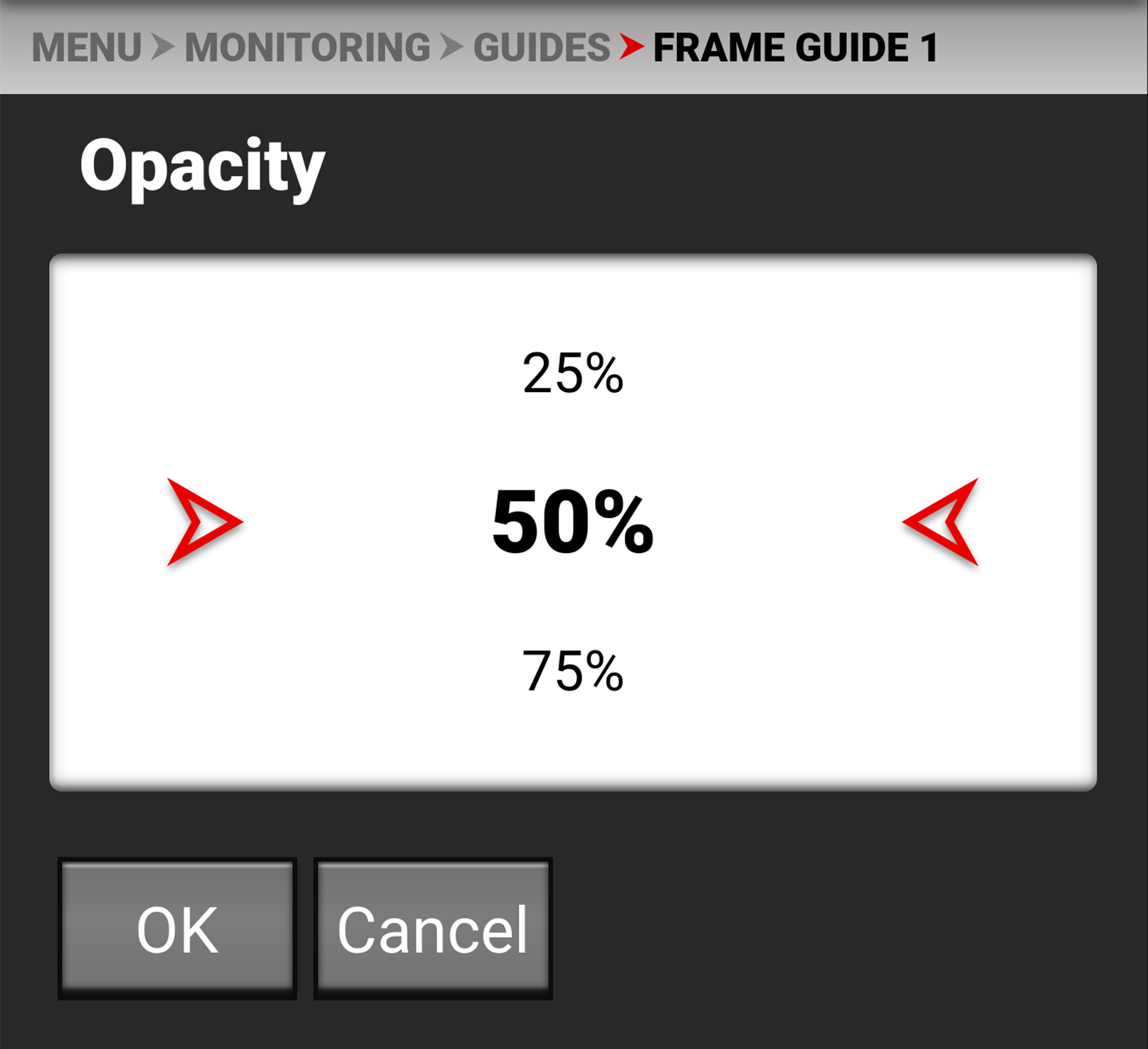 Use Opacity to select the percentage of opacity for the Frame Guide: