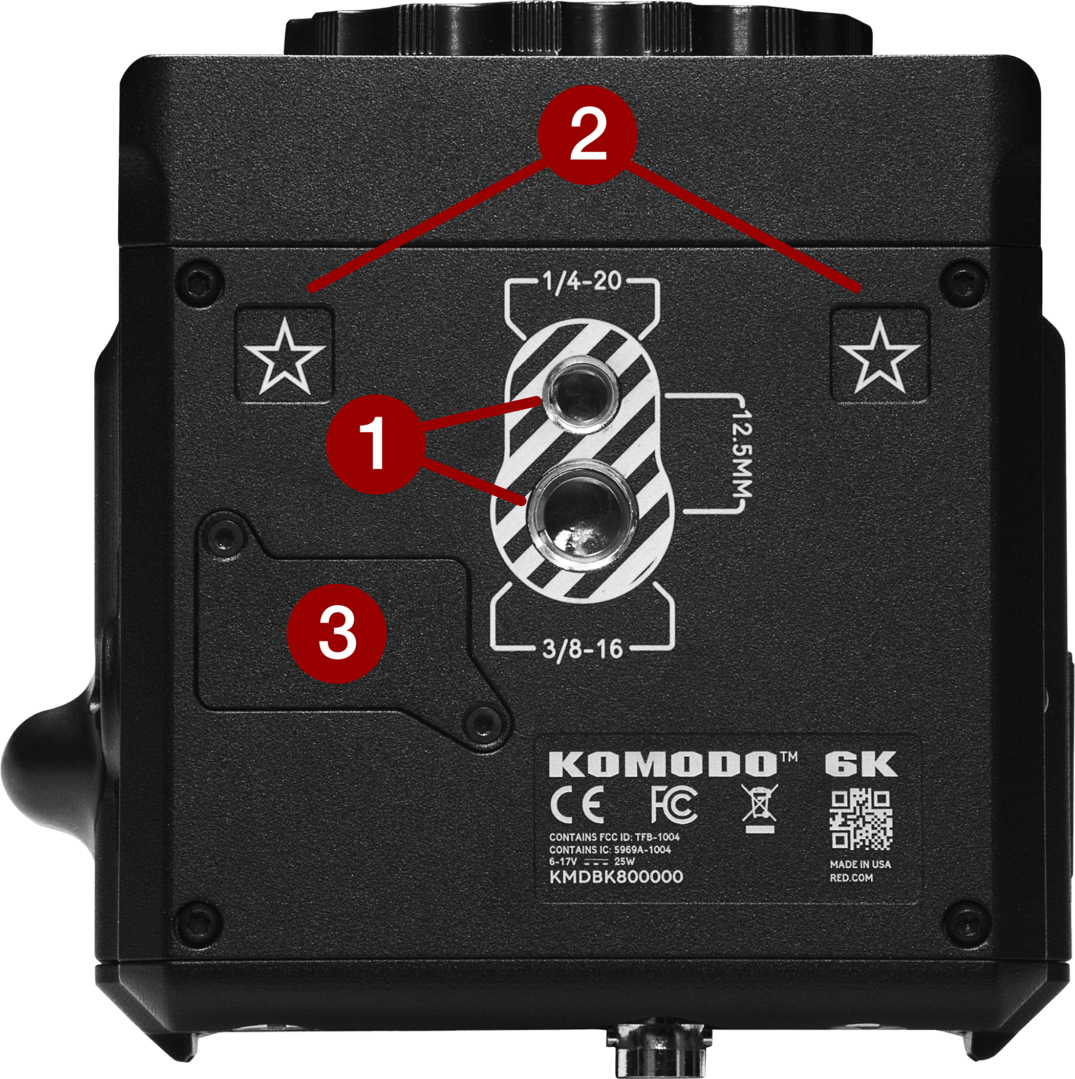 1/4-20 mounting holes for optional accessories (refer to KOMODO Outrigger Handle) |