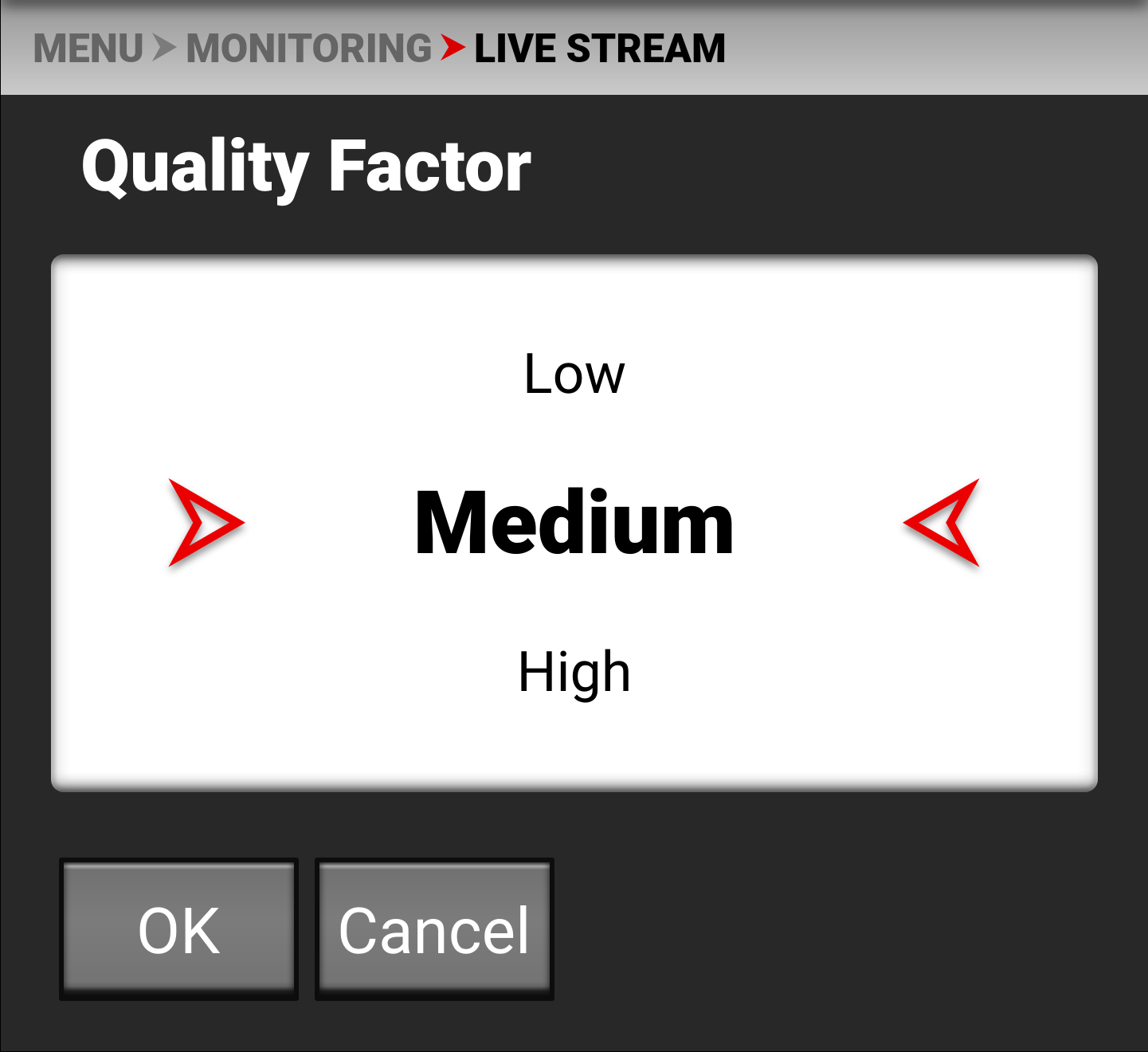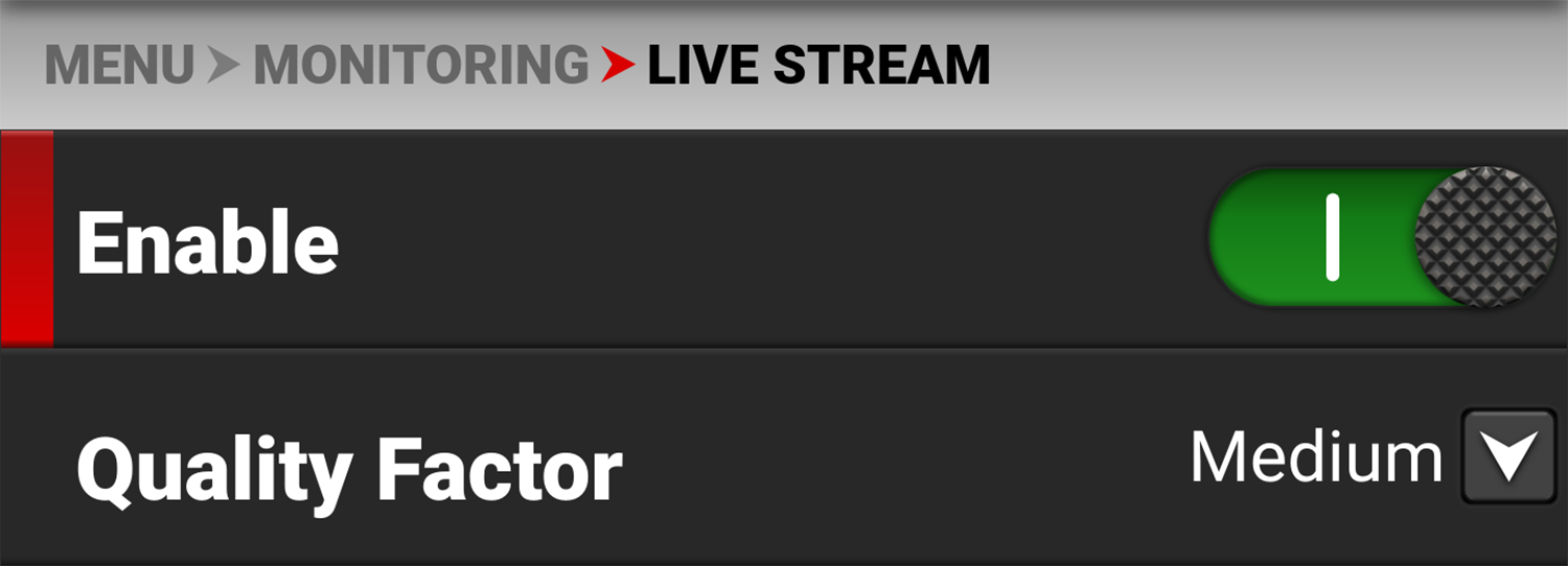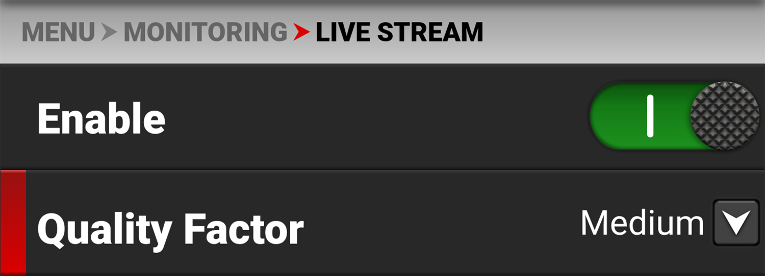 Use Quality Factor, when Live Streaming is enabled, to control the video quality the camera's output stream. Lower quality can stream over a longer distance.