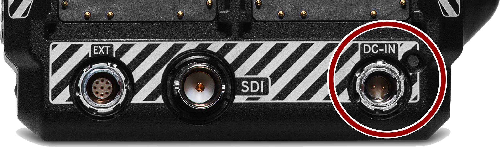 Connect the 2-pin 0B ODU DC power Adaptor plug to this port to provide the camera with continuous DC power. The RED power Adaptor provides DC power to operate the camera and to recharge the attached Batteries.