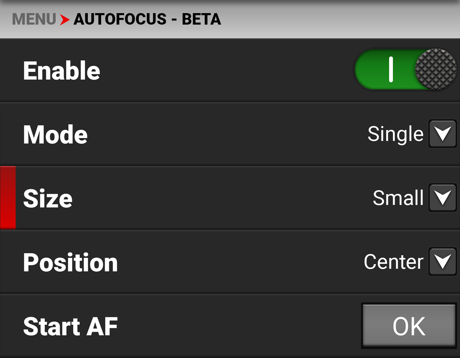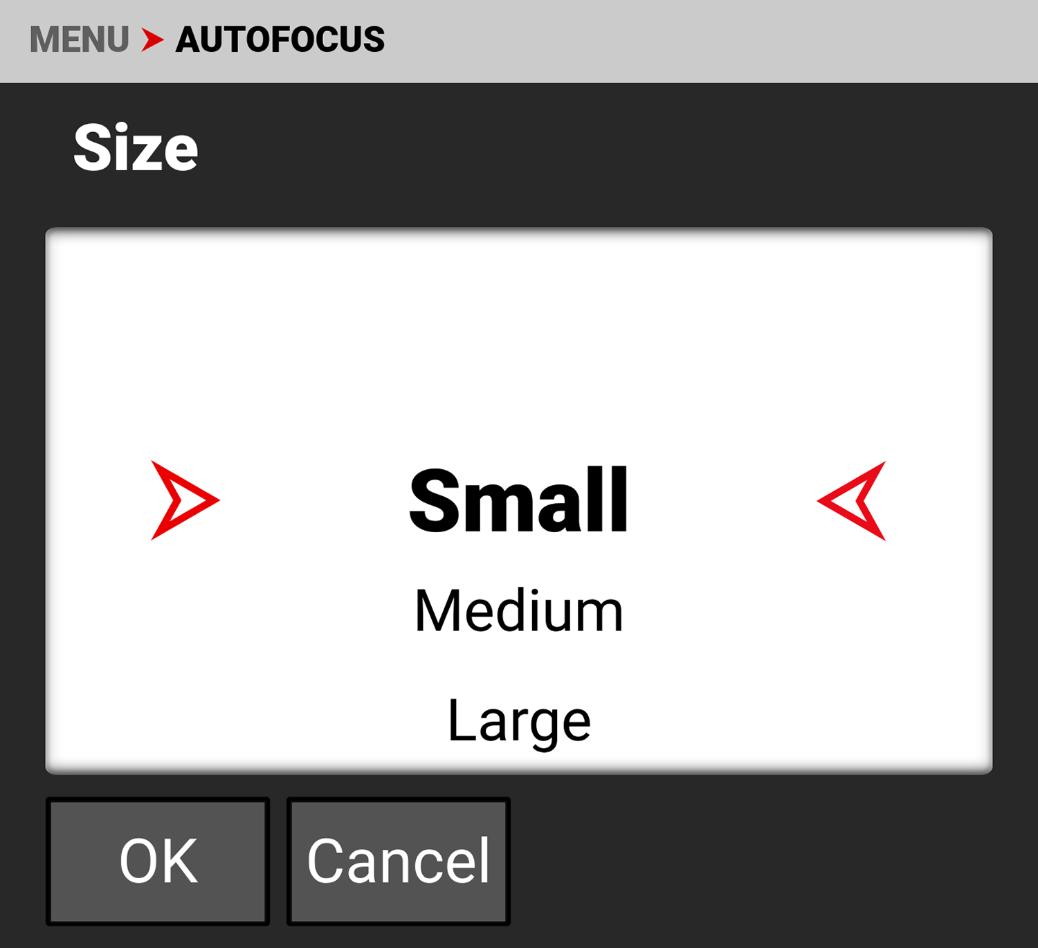 Use Size to choose what size area you want the camera to use for the autofocus feature. The lens must support autofocus for the camera to use this feature.