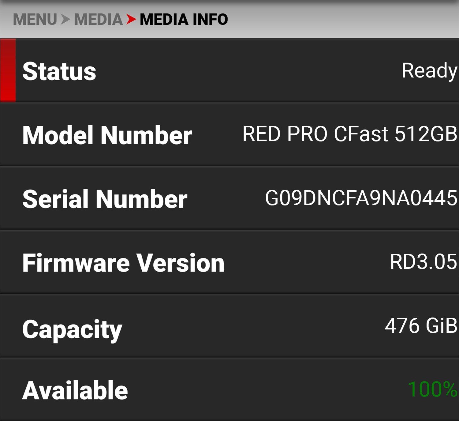 Use Media Info to display the CFast media card information.