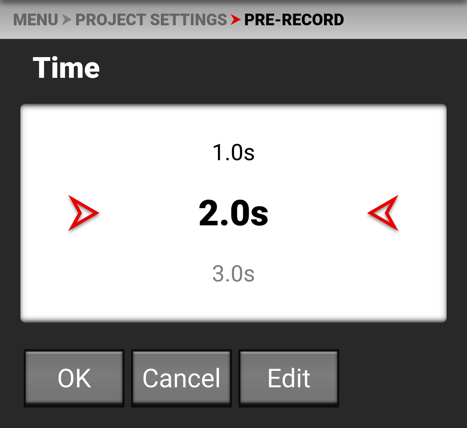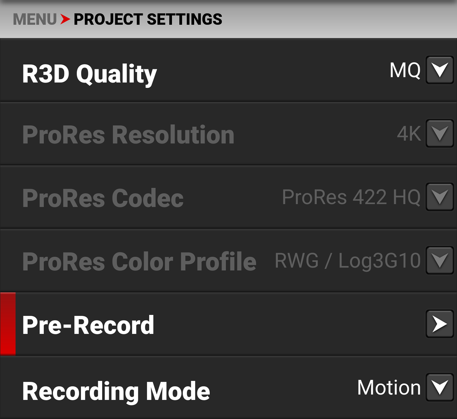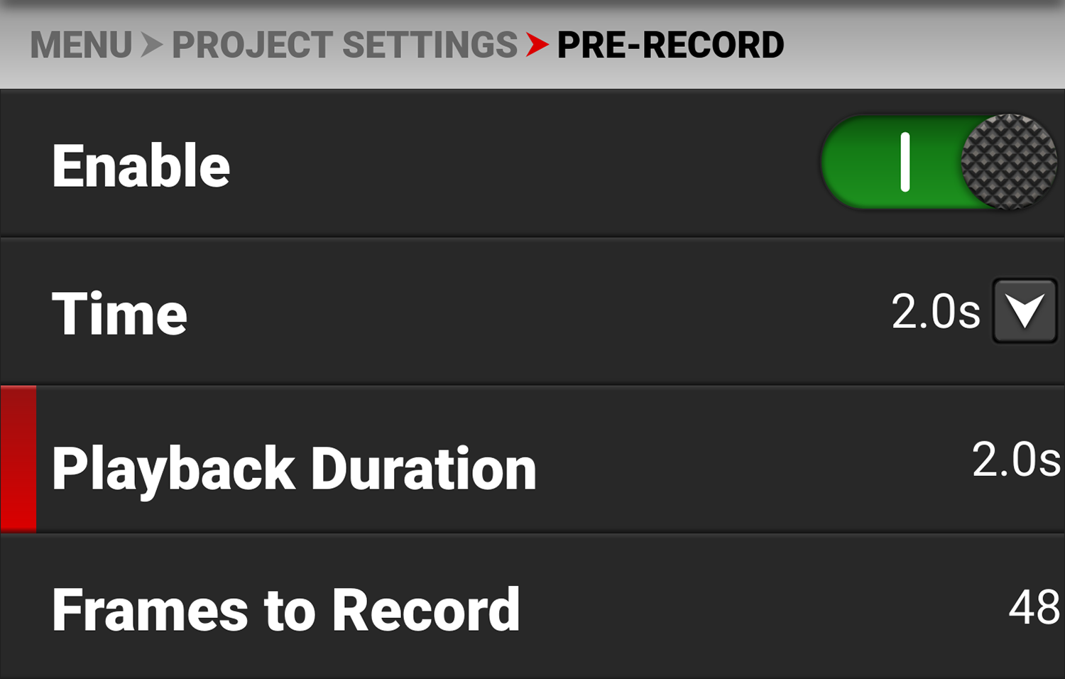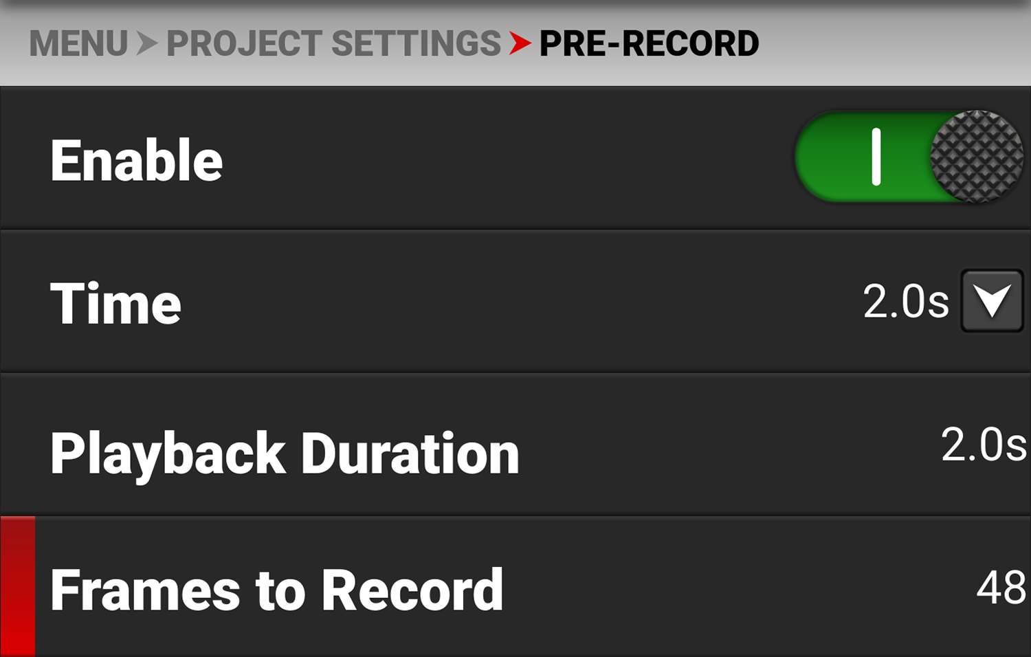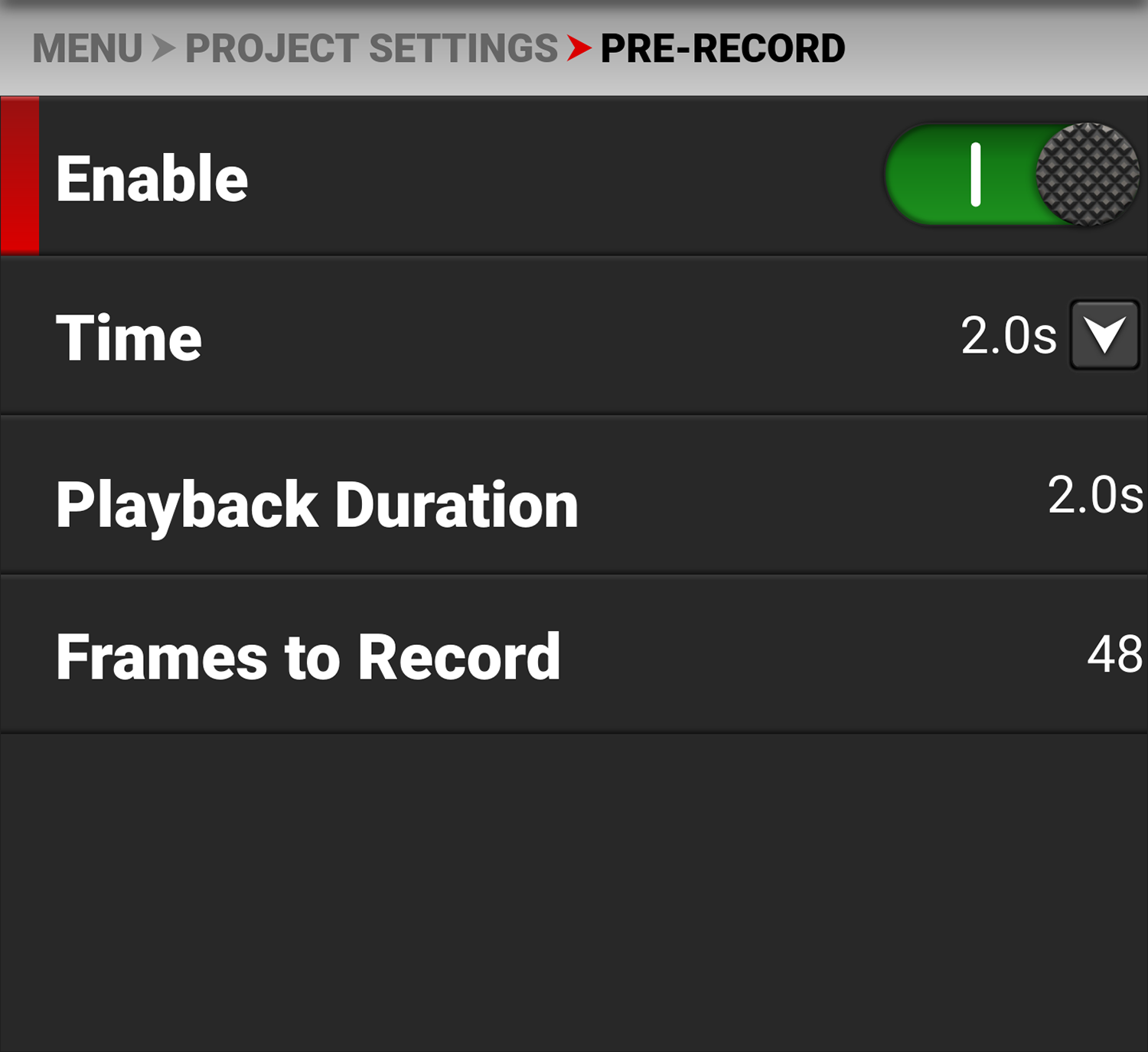 Use the Pre-Record menu to enable or disable Pre-Record, and to adjust the length of the Pre-Recorded clip.
