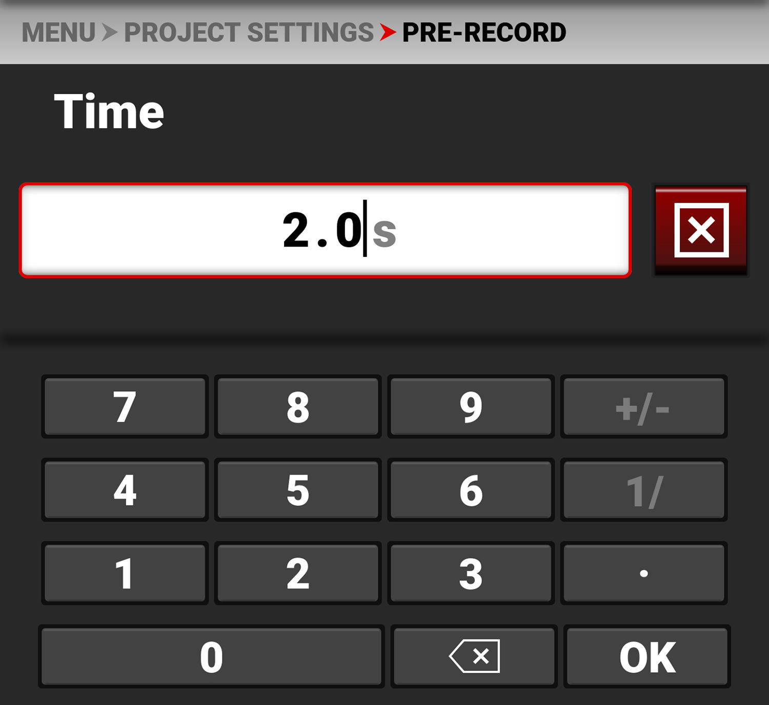 You can set the Pre-Record clip to record from half a second up to 30 seconds, depending on the format, file type, resolution, and quality. The default setting is 2 seconds at the default Project Time Base of 23.98 FPS.
