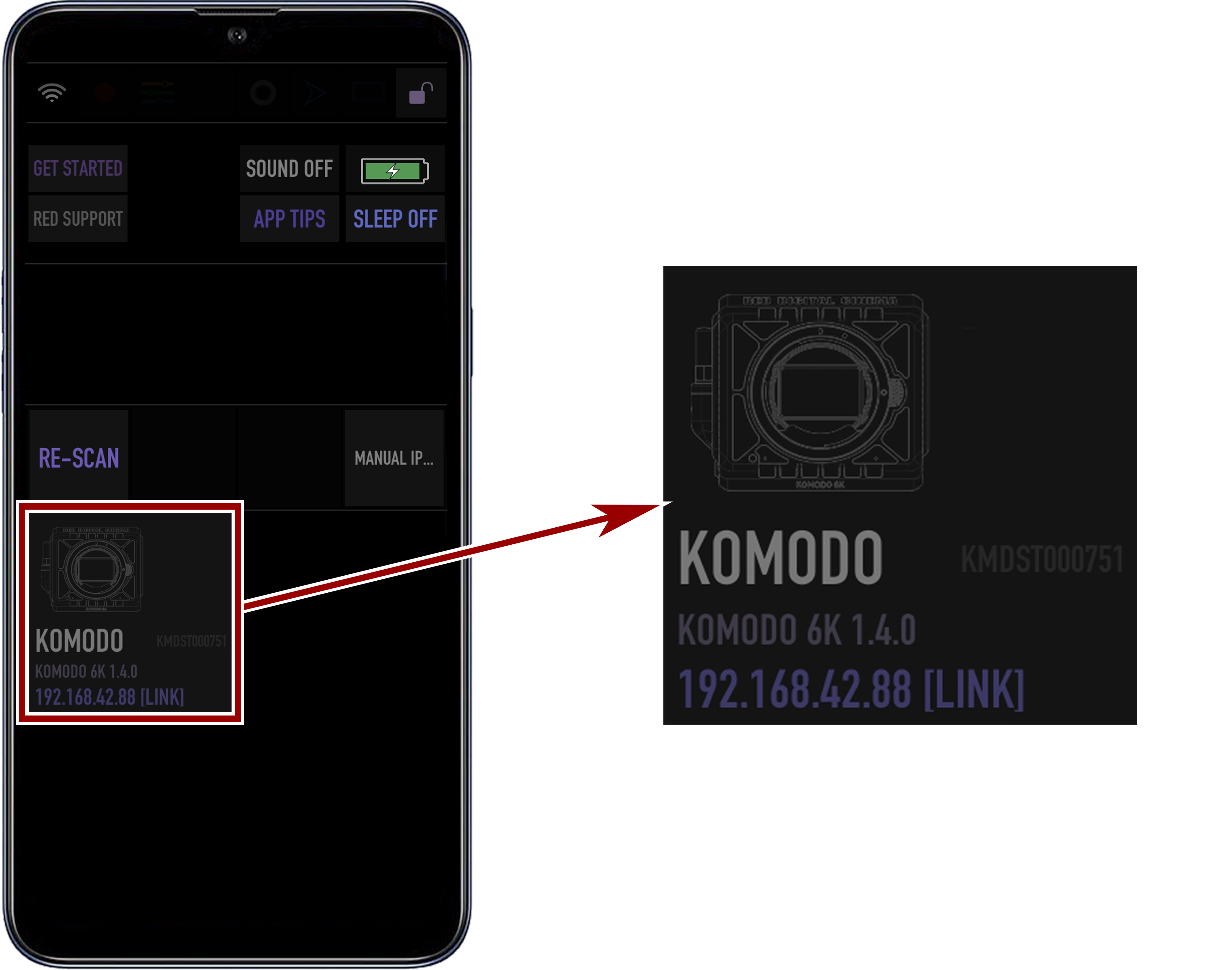 The camera displays the Android device's IP address in the KOMODO Link Adaptor screen: