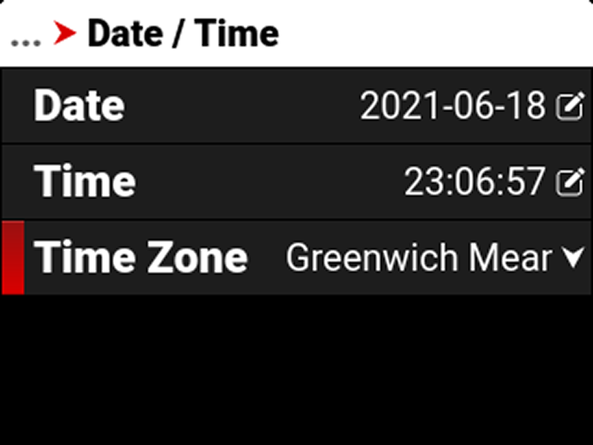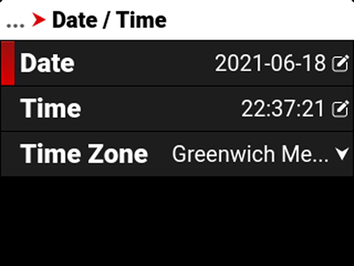 Use the Date / Time menu to reset the internal clock of the camera. The time and date are timestamped on R3D® files when recording to the media. The camera uses the 24-hour clock convention (military time). For example, enter 2:35 PM as 14:35:00.
