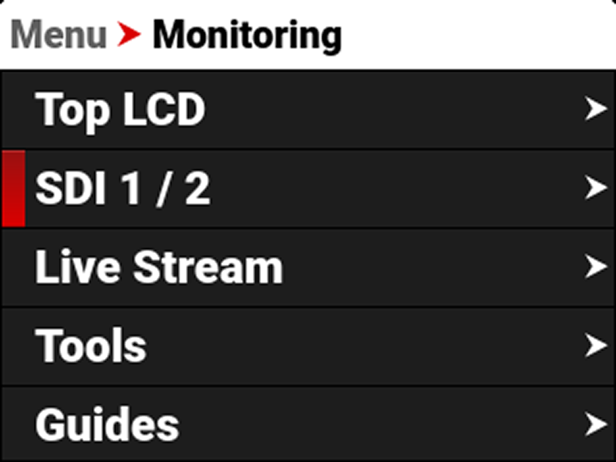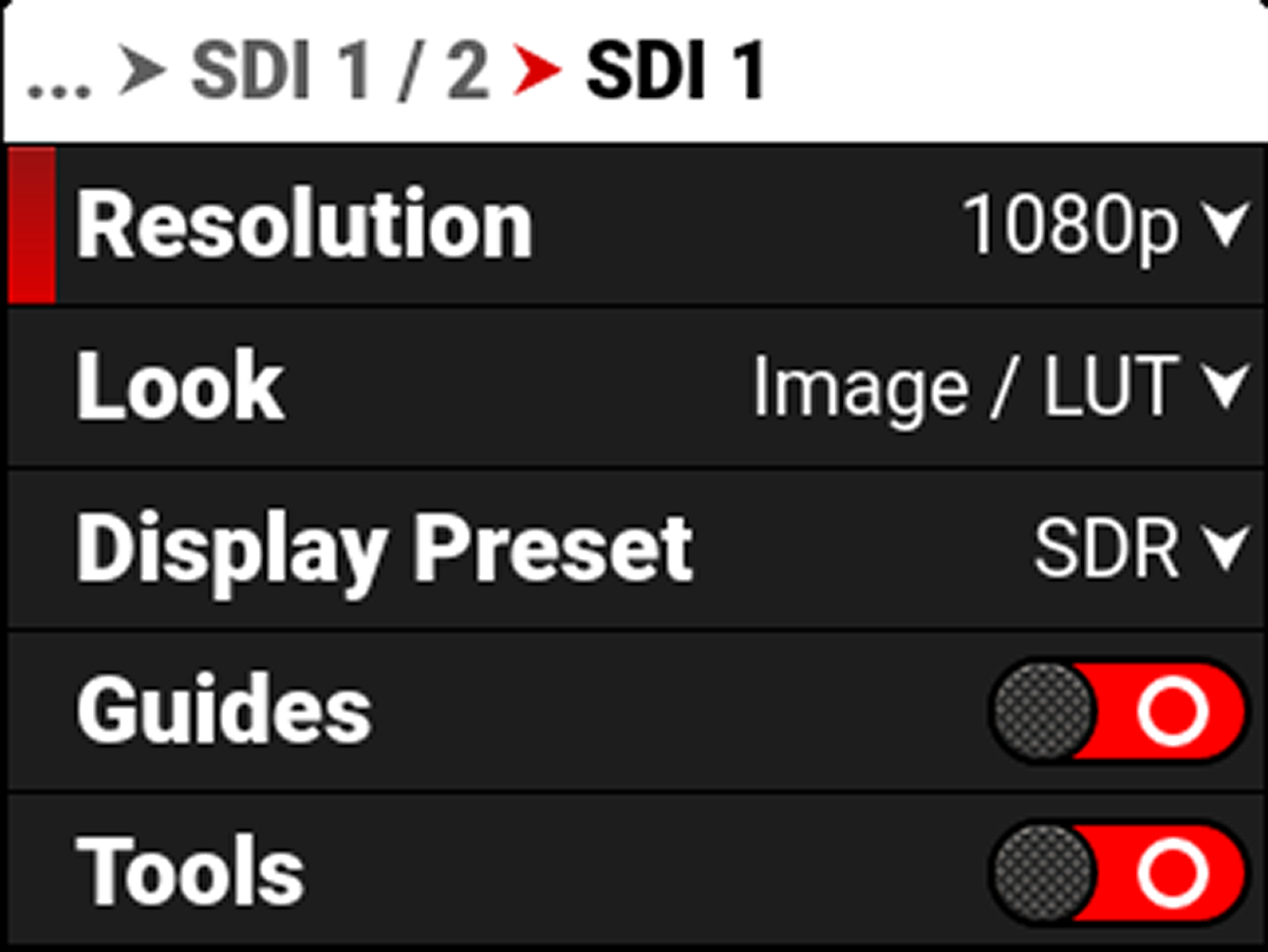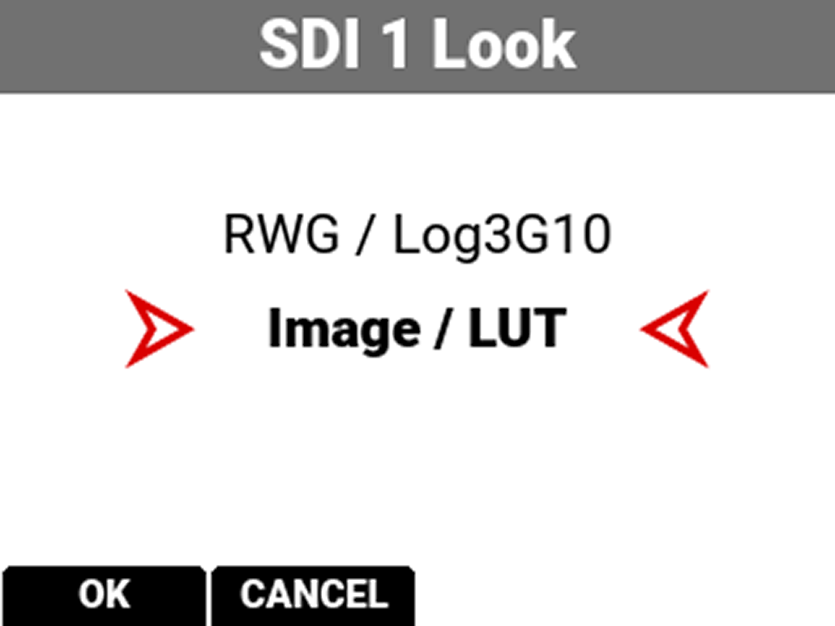 You can select the look of the image preview signal sent to the SDI port. The selections include: • REDWideGamutRGB / Log3G10 • Image / LUT (default) |