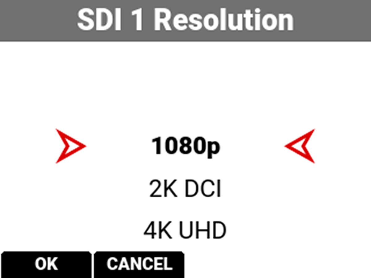 Use resolution to select one of the following SDI port resolution settings: • 1080p • 2K DCI • 4K UHD • 4K DCI The resolution selected here controls the SDI output resolution of the preview page. |
