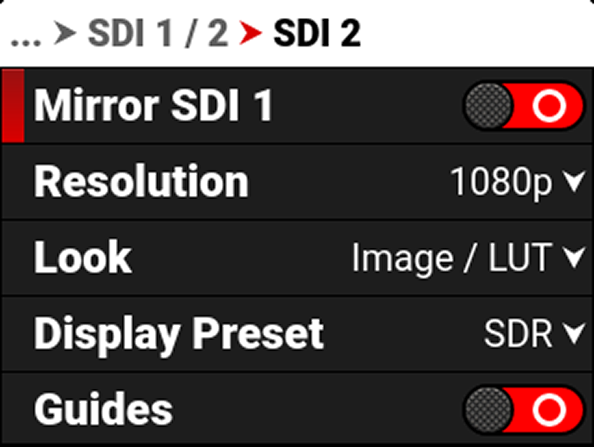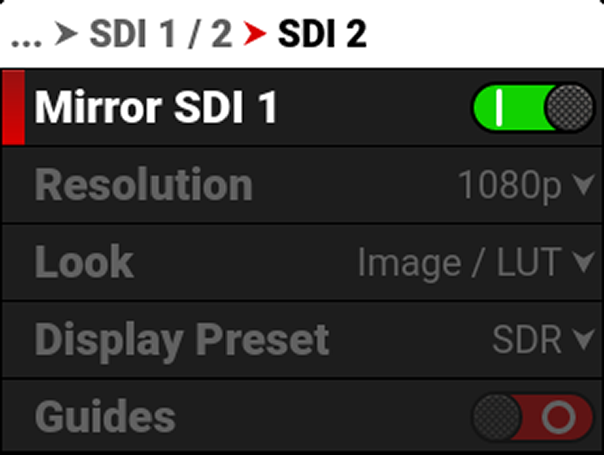 You can quickly configure SDI 2 to match SDI 1 by selecting Mirror SDI 1 on the SDI 2 menu: