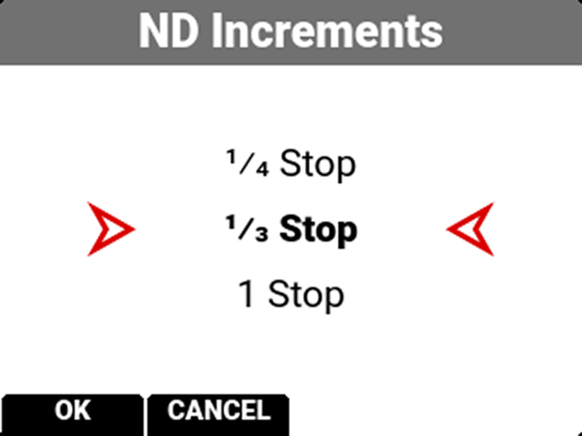 Press the button under ND+ to increase the ND value by the ND Increment value. Press the button under ND- to decrease the ND value by the ND Increment value.