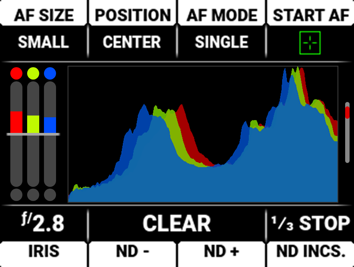 The Histogram Page contains the Autofocus Quick Settings, Exposure Meter, Histogram, and Iris/ND Quick Settings.