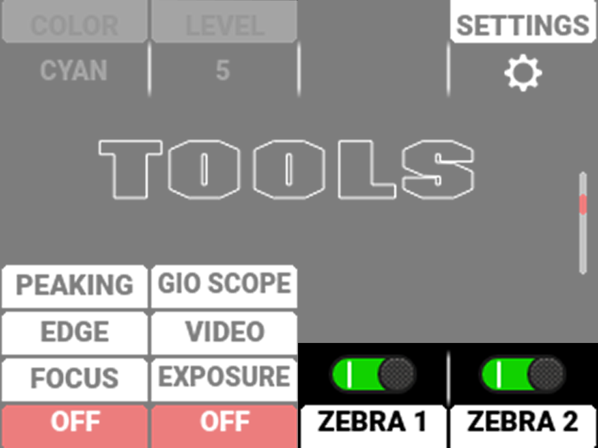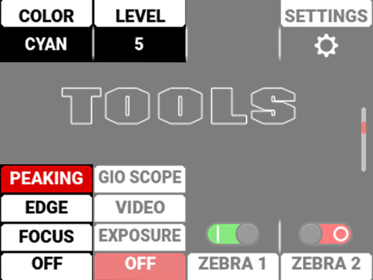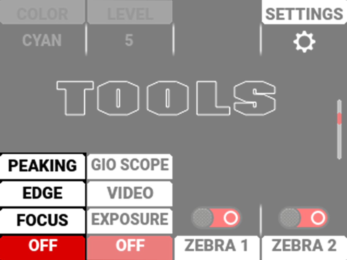 The Tools Page contains the Peaking Modes, False Color Modes, Zebra Tool Switches, and Quick Monitor Menu.