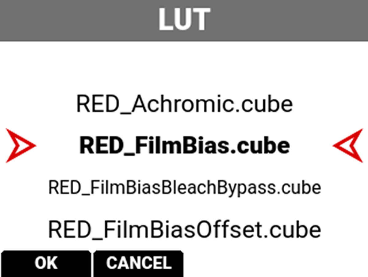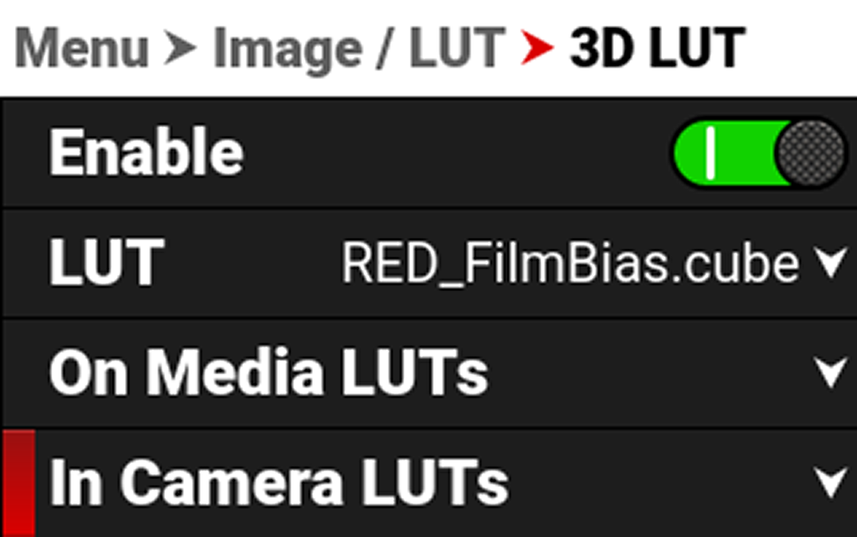 When you are recording in the R3D format, this LUT will be saved along with each clip on which it is activated during recording. The output file name format for the LUT is clip_LUT Name.cube.