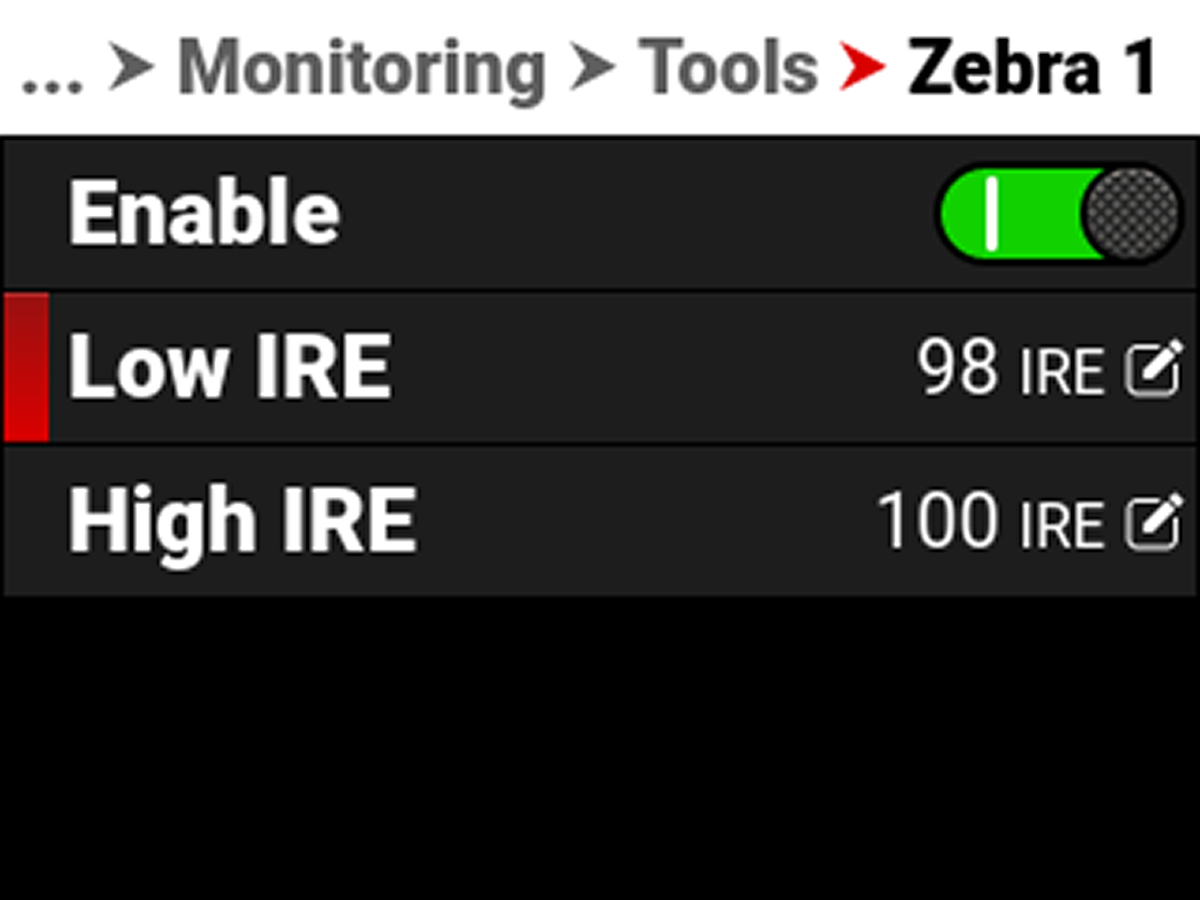 Enables red zebra stripes to indicate highlight exposure |