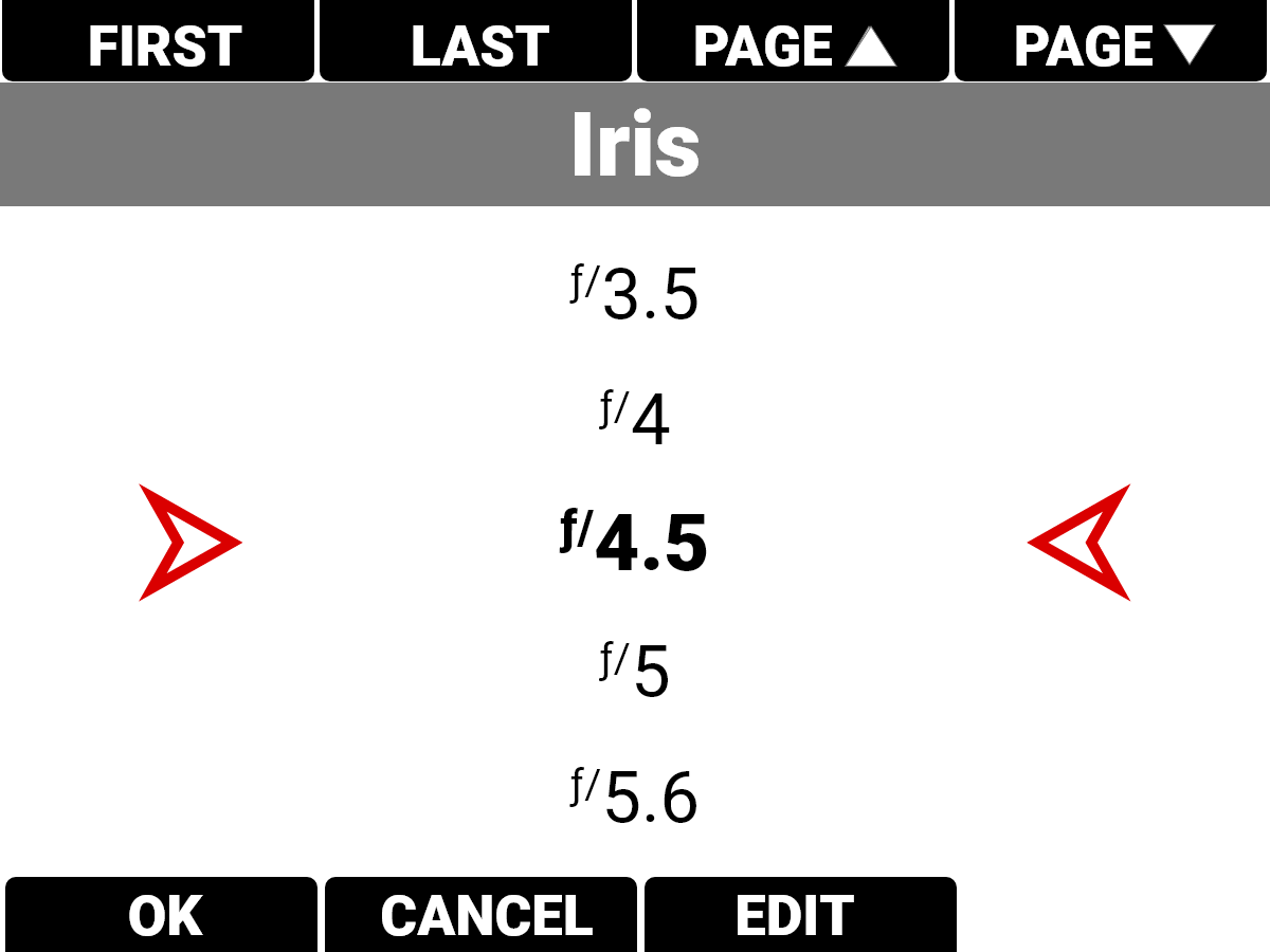 Use the Iris menu to select the camera lens f-stop. Press the button below Edit to open the keypad and enter the f-stop manually.