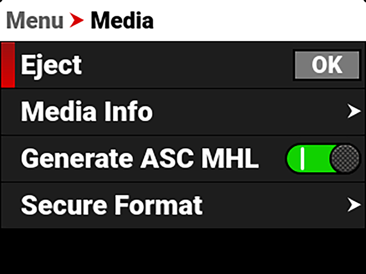 The camera supports exFAT as the file system for the media card to accommodate larger files and data rates. exFAT is supported both on macOS and MS Windows.