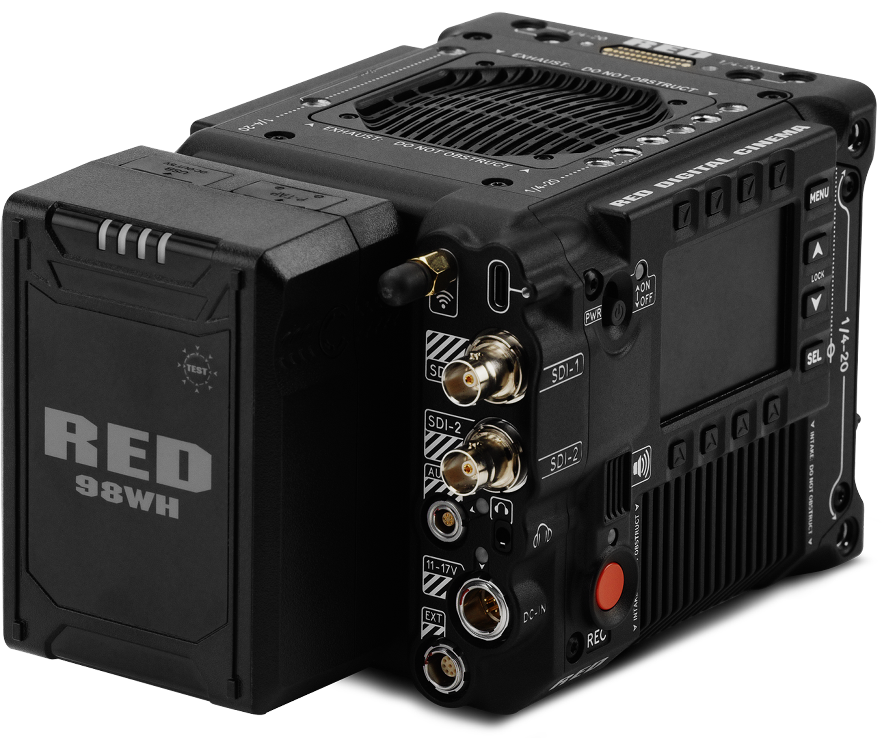 Insert a compatible V-Lock battery (refer to REDVOLT Batteries) in the battery slot. Slide the battery until it clicks.
