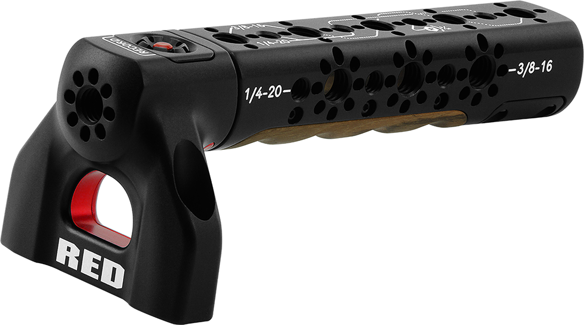 The V-RAPTOR XL Top Handle easily mounts to the top of the V-RAPTOR XL while offering a combination of comfort and utility for carrying or shooting clips with your camera. This top-mounted machined handle features ergonomic Bocote wood inlays with camera trigger control. It also can be configured in multiple ways when used with the Top Handle Extension Kit and includes multiple 1/4-20 and 3/8-16 threads.