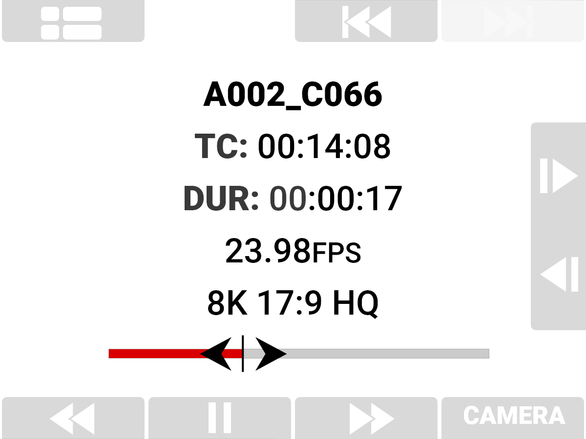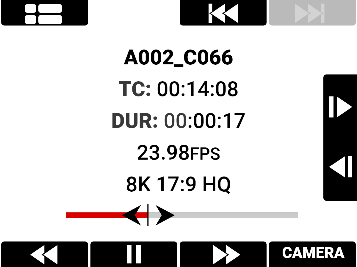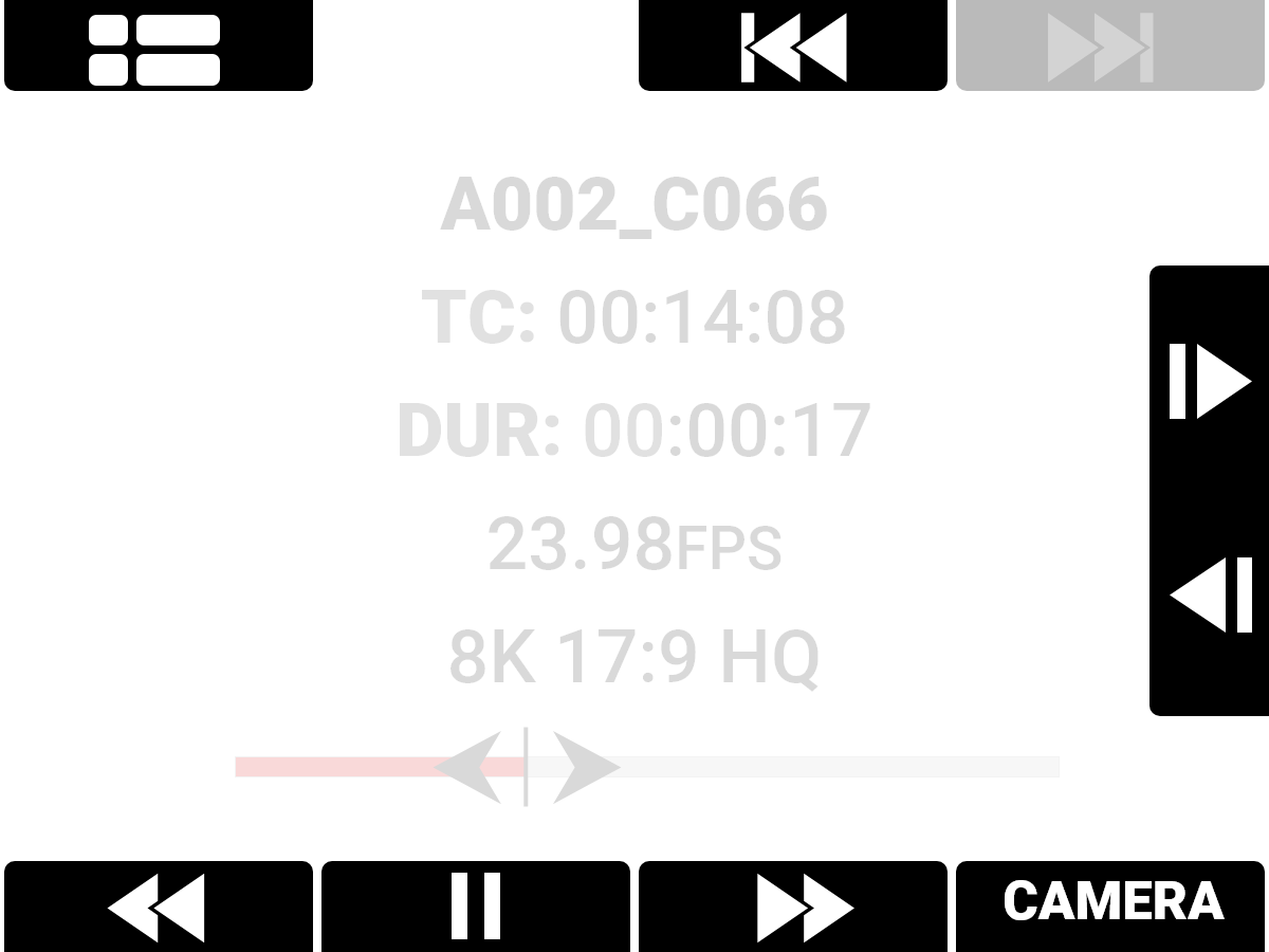 With the Playback screen buttons you can view the Clip list, move to the start of the clip, fast reverse, play/pause, fast forward, and move forward and reverse by a single frame.