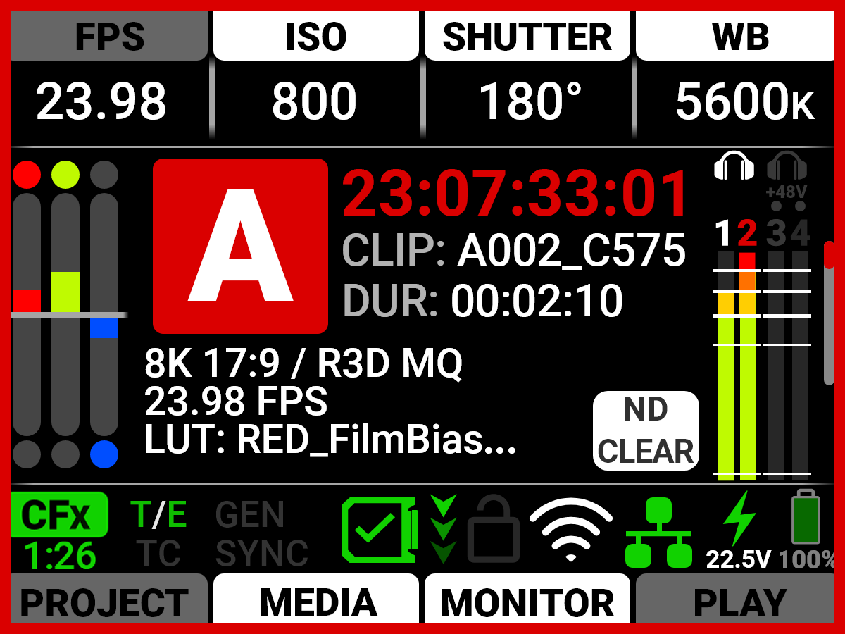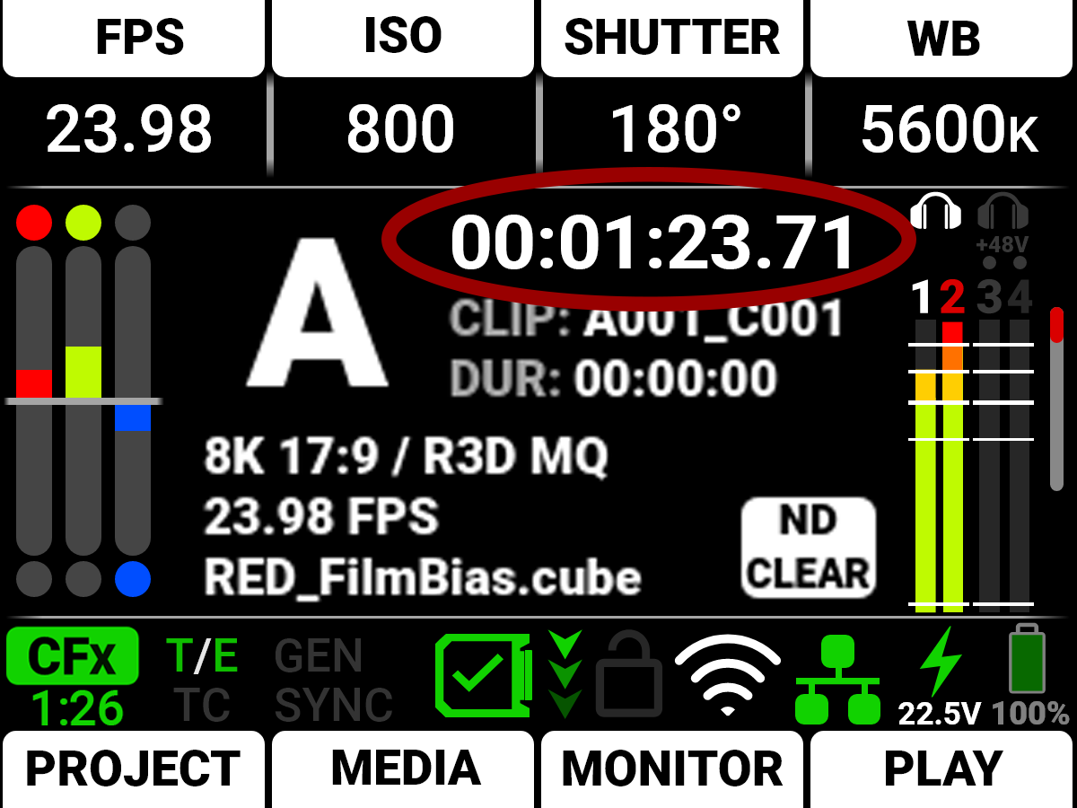 The Clip area displays either the currently recording clip name, or the upcoming clip name designated in the Project Settings menu (refer to Slate).