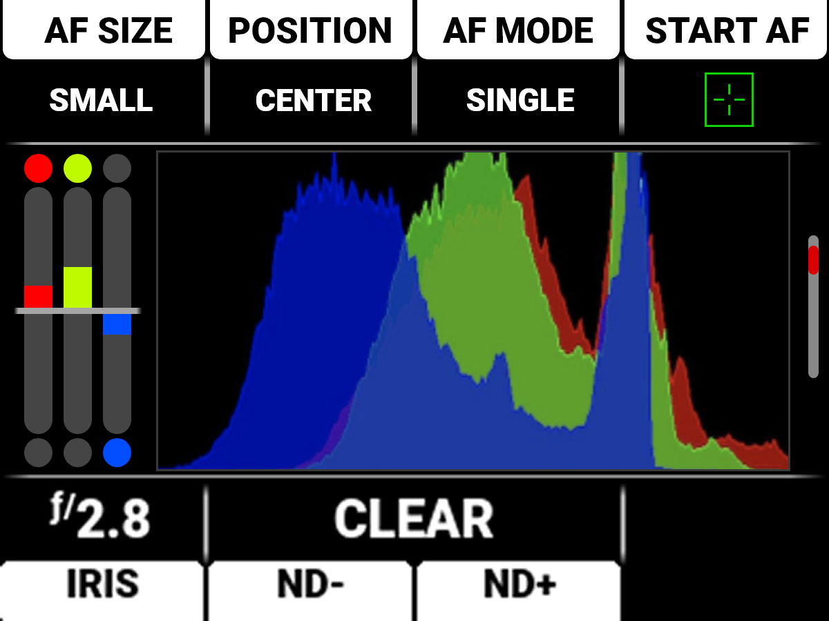 The Histogram Page contains the Autofocus Quick Settings, Exposure Meter, Histogram, and Lens