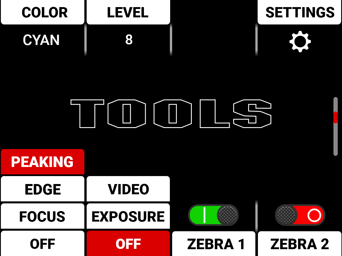 The Tools Page contains the Peaking Tools, Exposure Tools, Zebra Tools, and Quick Monitor Menu (refer to Tools Page).