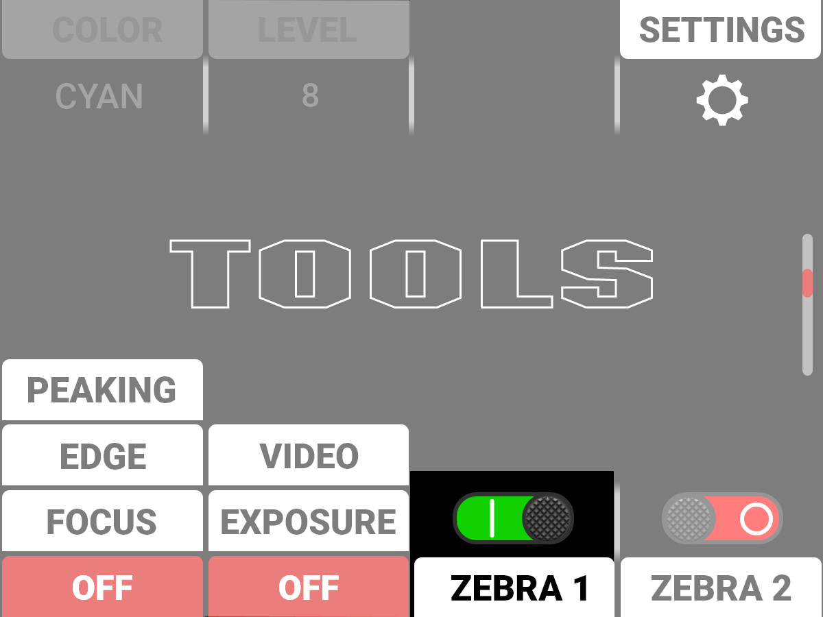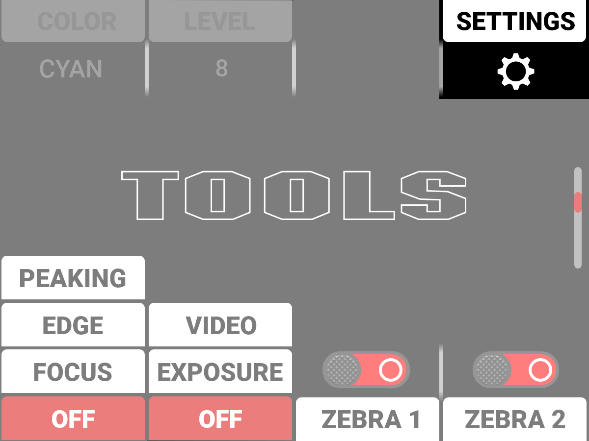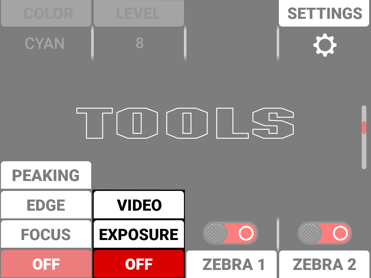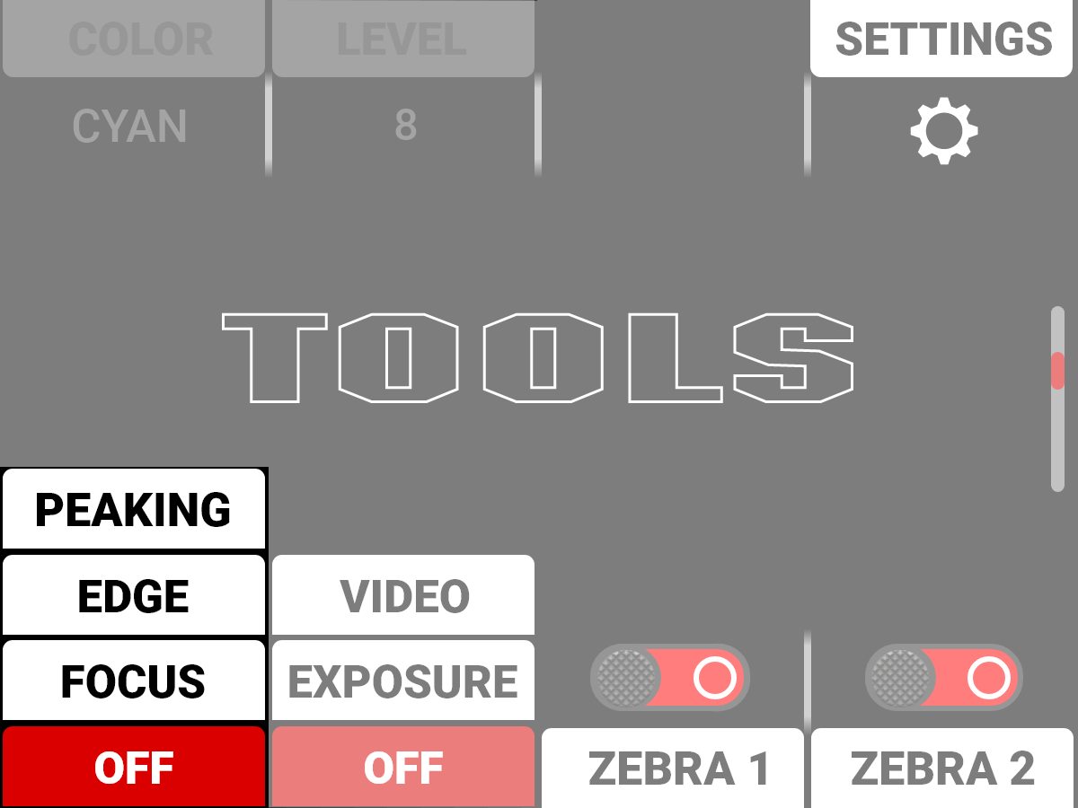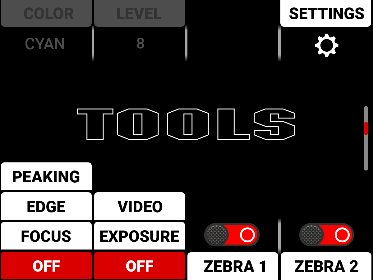 The Tools Page contains the Peaking Modes, False Color Modes, Zebra Tool Switches, and Quick Monitor Menu.
