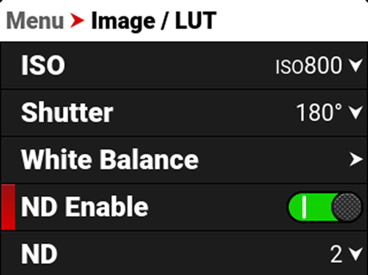 You can also use the ND buttons on the left side of the camera to toggle ND between clear and the last used ND setting (ND/CLR) and to adjust the ND filter increments up or down. Refer to Camera Body more information.