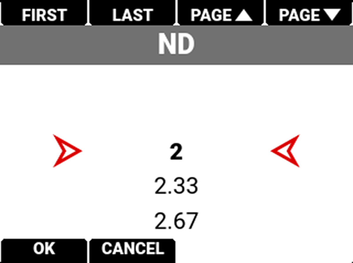 The ND filter range is 2-7 stops or 0.6 to 2.1 density. From the Status Settings menu, you can use the ND Display Mode submenu to select Stops or Density units, and you can use the ND Increments submenu to select the size of the ND increments displayed on the camera (refer to Status Settings for more information).