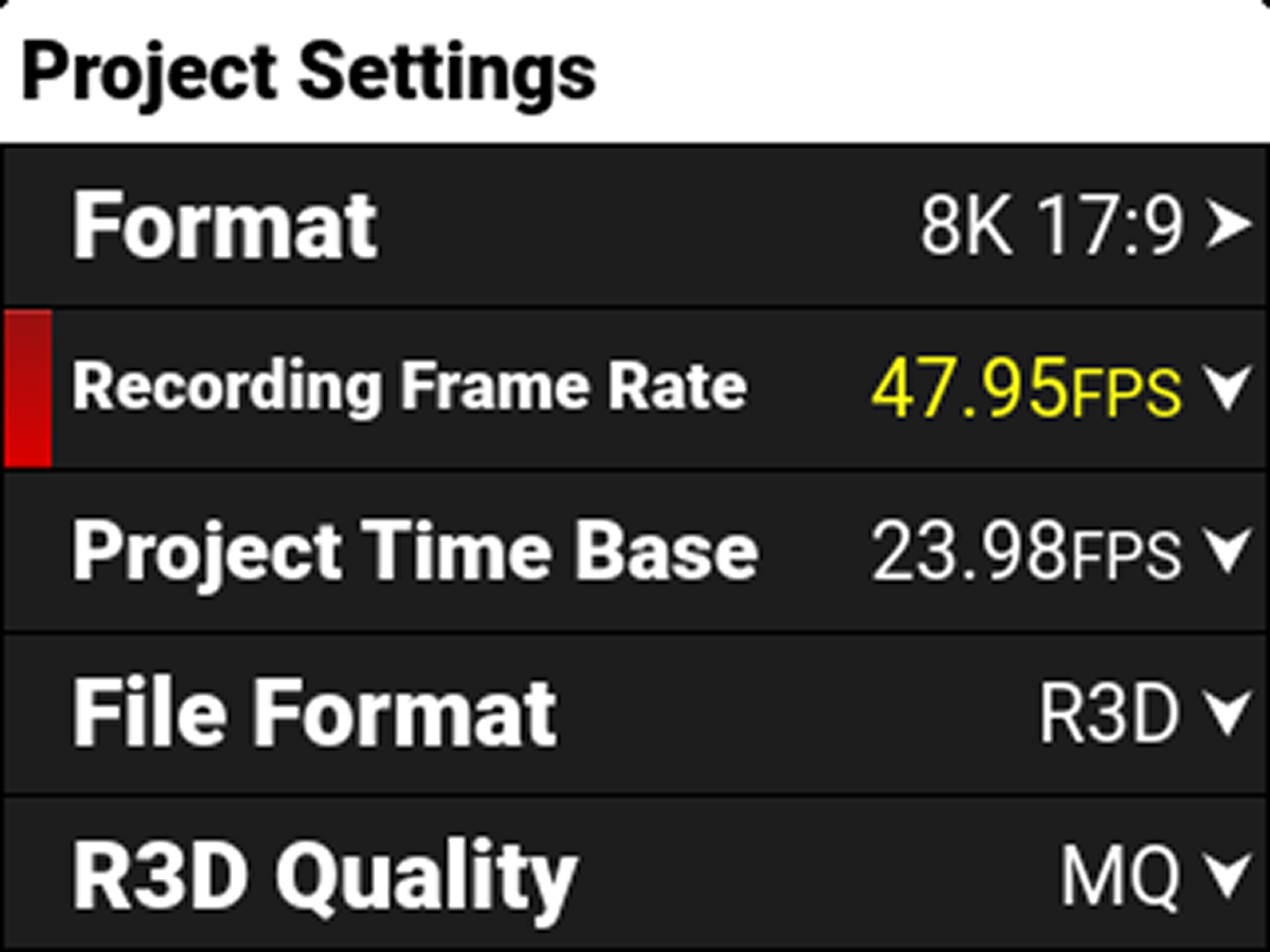 When you select a Project Time Base, the camera automatically selects a matching Recording Frame Rate and an R3D Quality (when possible). You must change the Recording Frame Rate and R3D Quality after the Project Time Base to select a different setting.