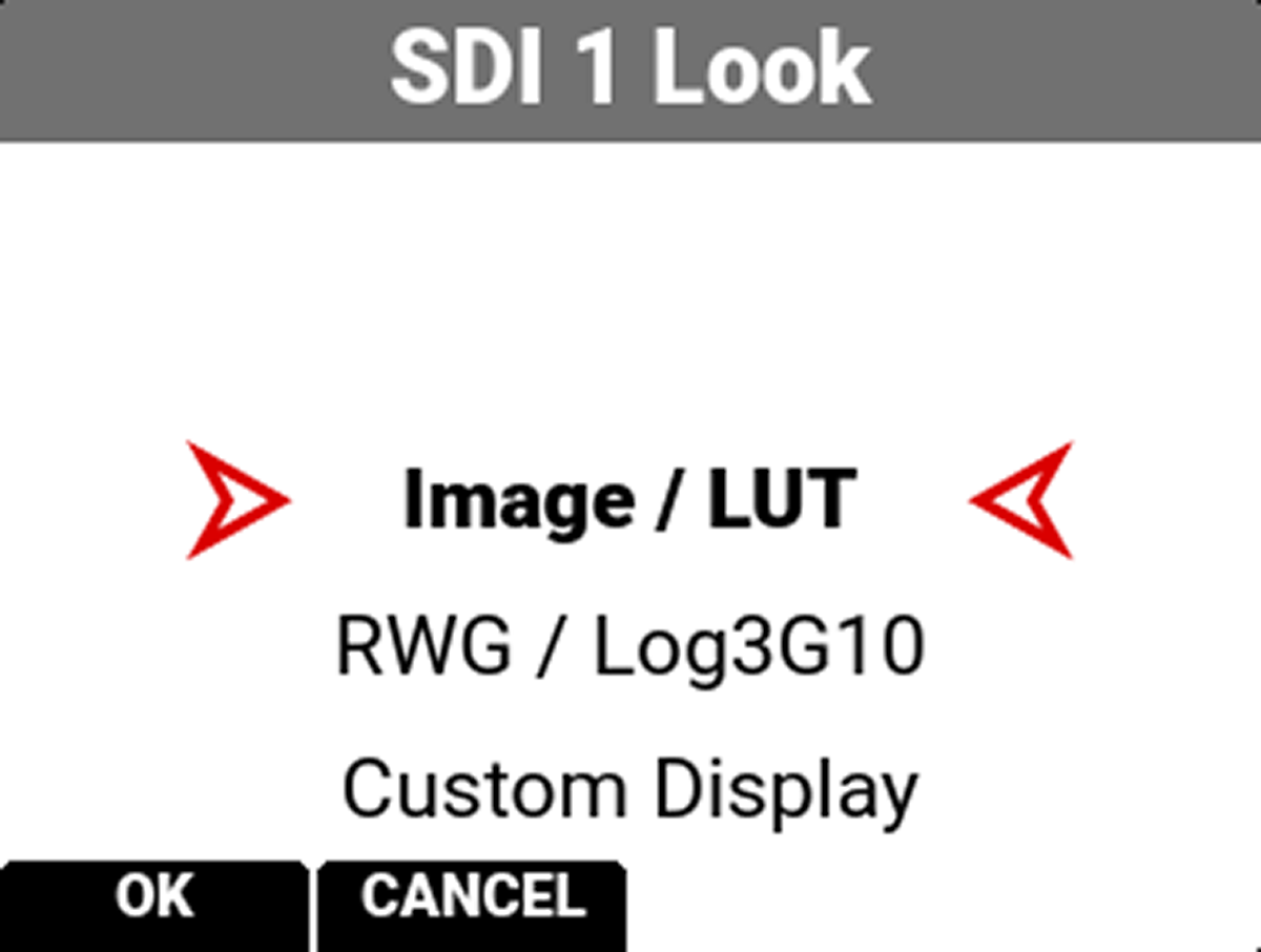 You can select the look of the image preview signal sent to the SDI port. The selections include: • Image / LUT (default) • REDWideGamutRGB / Log3G10 • Custom Display (enables the Custom Display menu) |