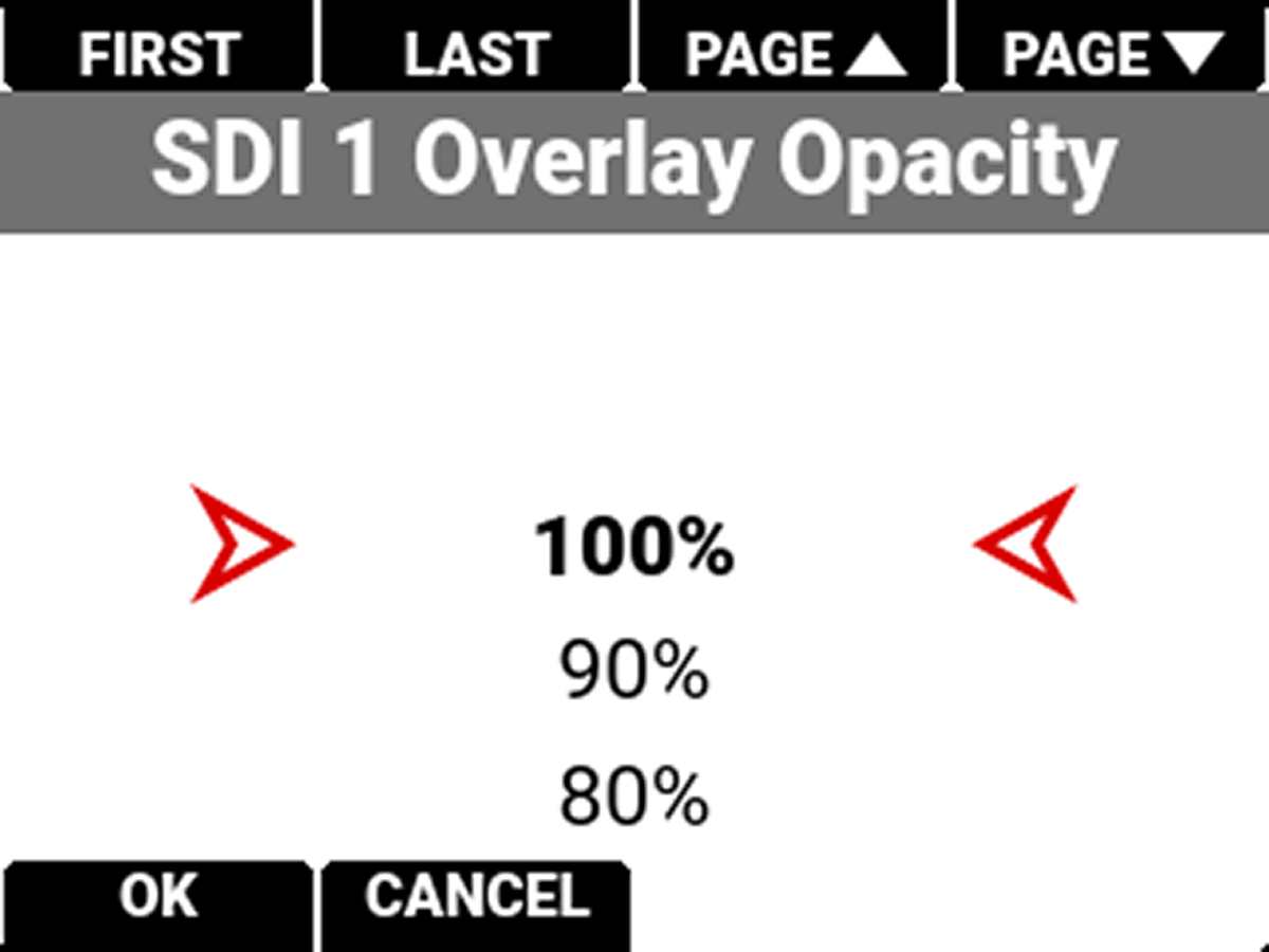 Use Overlay Opacity to select the percentage of opacity you want the overlay to display on the SDI output. The opacity values the camera can display are between 100% and 0%. |