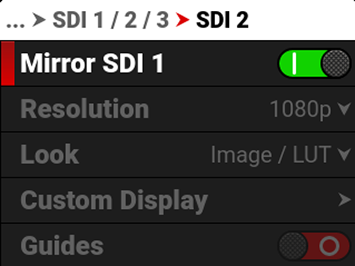 You can quickly configure SDI 2 to match SDI 1 by selecting Mirror SDI 1 on the SDI 2 menu: