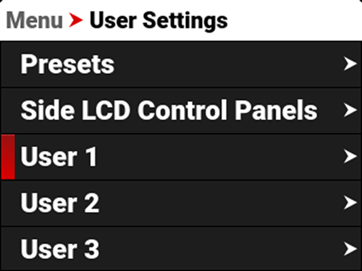 The User menus contain the settings you saved to quickly configure your camera.