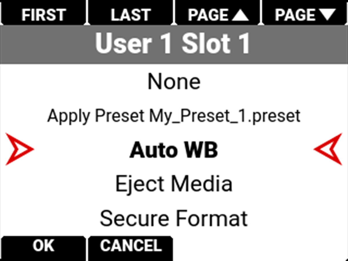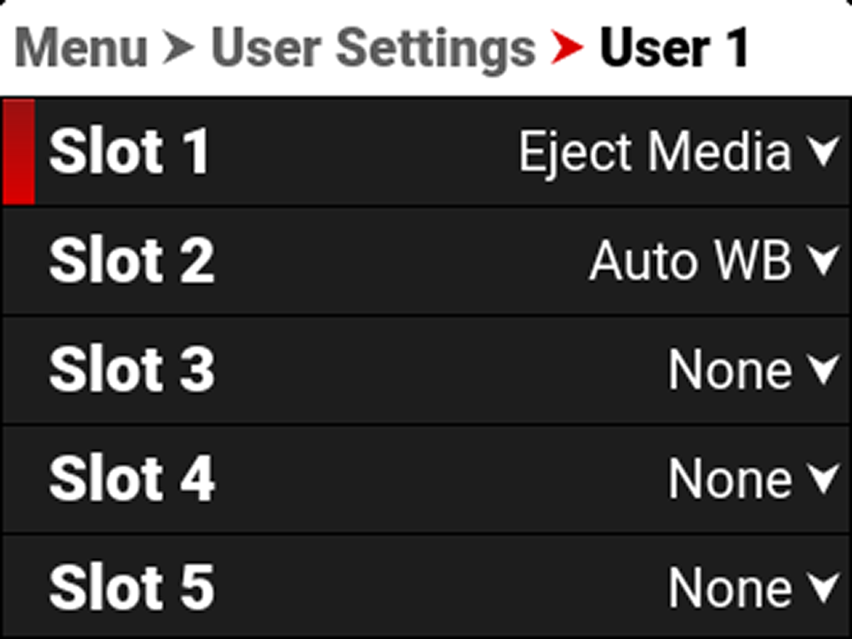 Use Slots 1-8 to assign quick user settings for the camera.