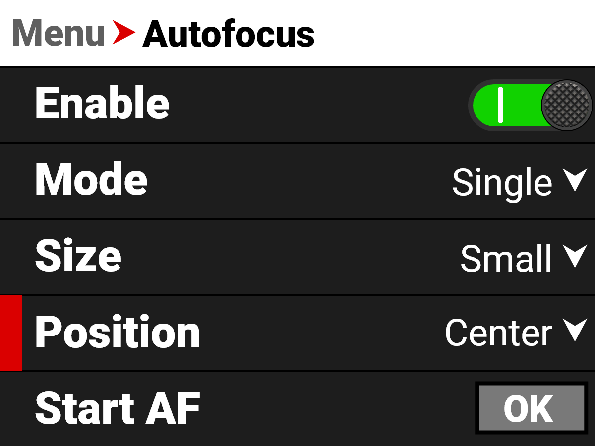Use Position to specify the position of the autofocus area on the sensor. You can also use the DSMC3™ RED® Touch 7.0" LCD to drag the autofocus area to any location.