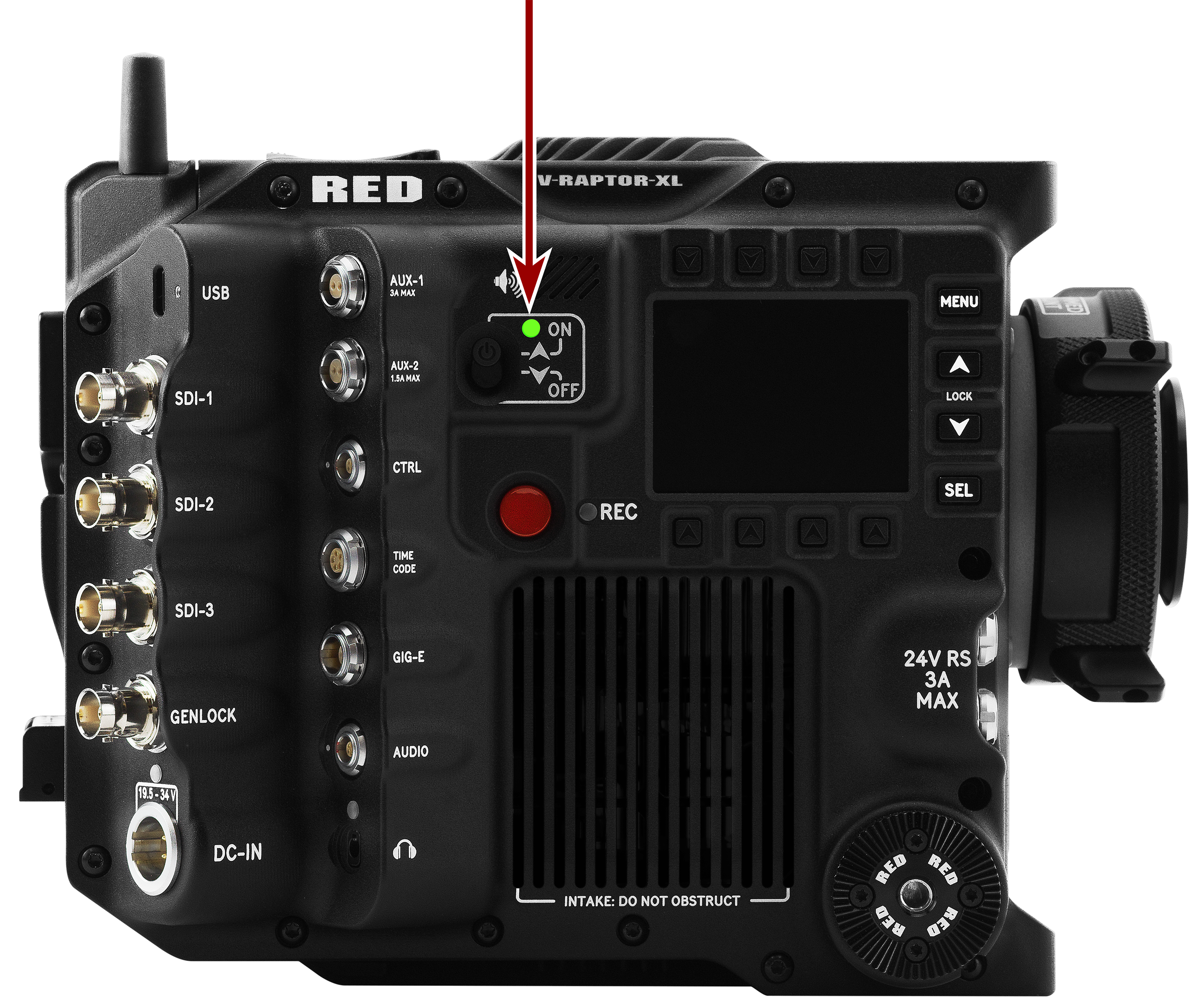 - Attach a power source (V-RAPTOR™ XL 8K VV Power Adaptor or REDVOLT® XL Batteries) to the camera.
