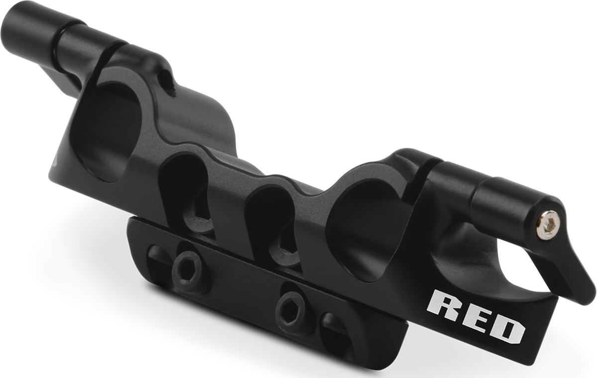 The V-RAPTOR™ XL Bottom 15 mm Rod Support Bracket securely attaches to the bottom of the camera, or optionally, to the V-RAPTOR™ XL Riser Plate, and it provides two 15 mm LWS spaced rod clamps, allowing for mounting of accessories such as matte boxes, and focus, iris, and zoom motors.