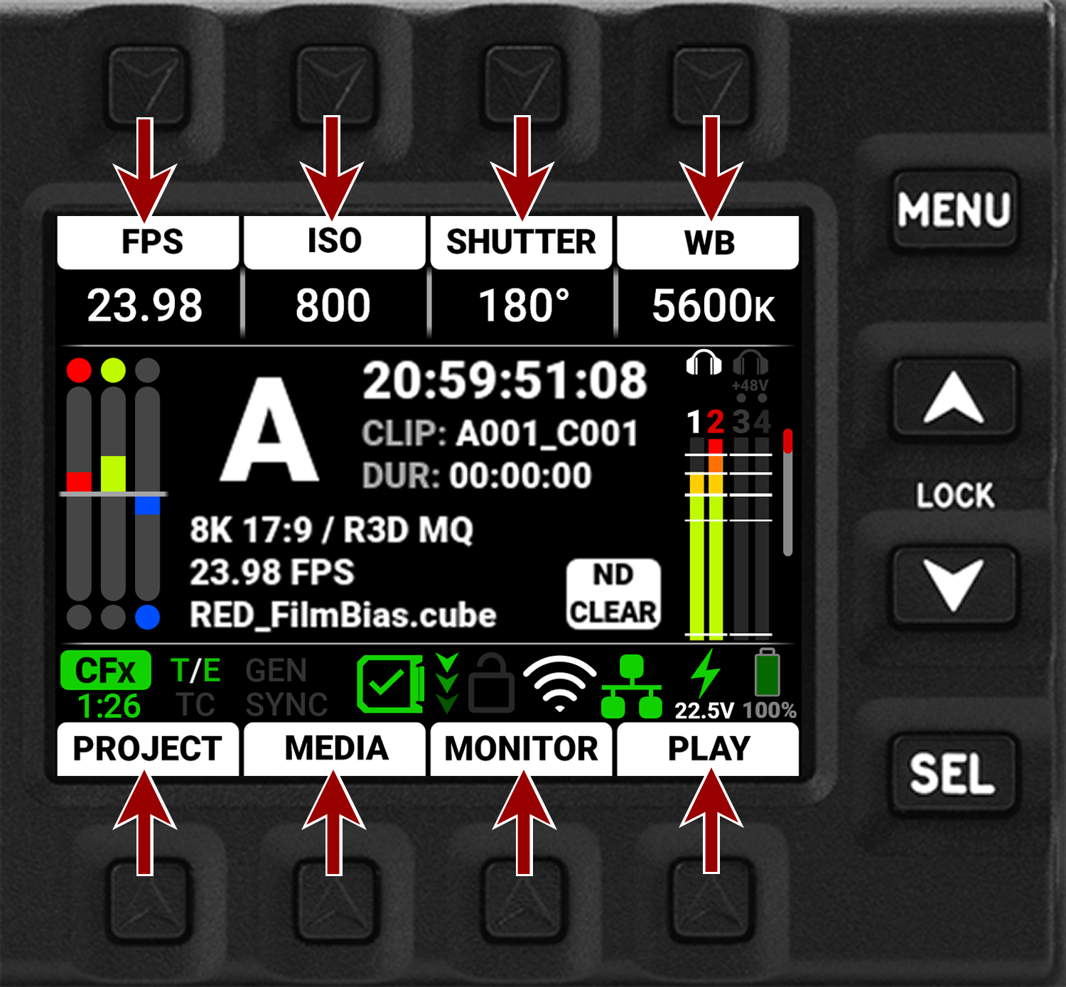 This section describes the graphical user interface (GUI) for the built-in camera side LCD. Durable controls enable convenient access to menus, camera features, and critical camera information.