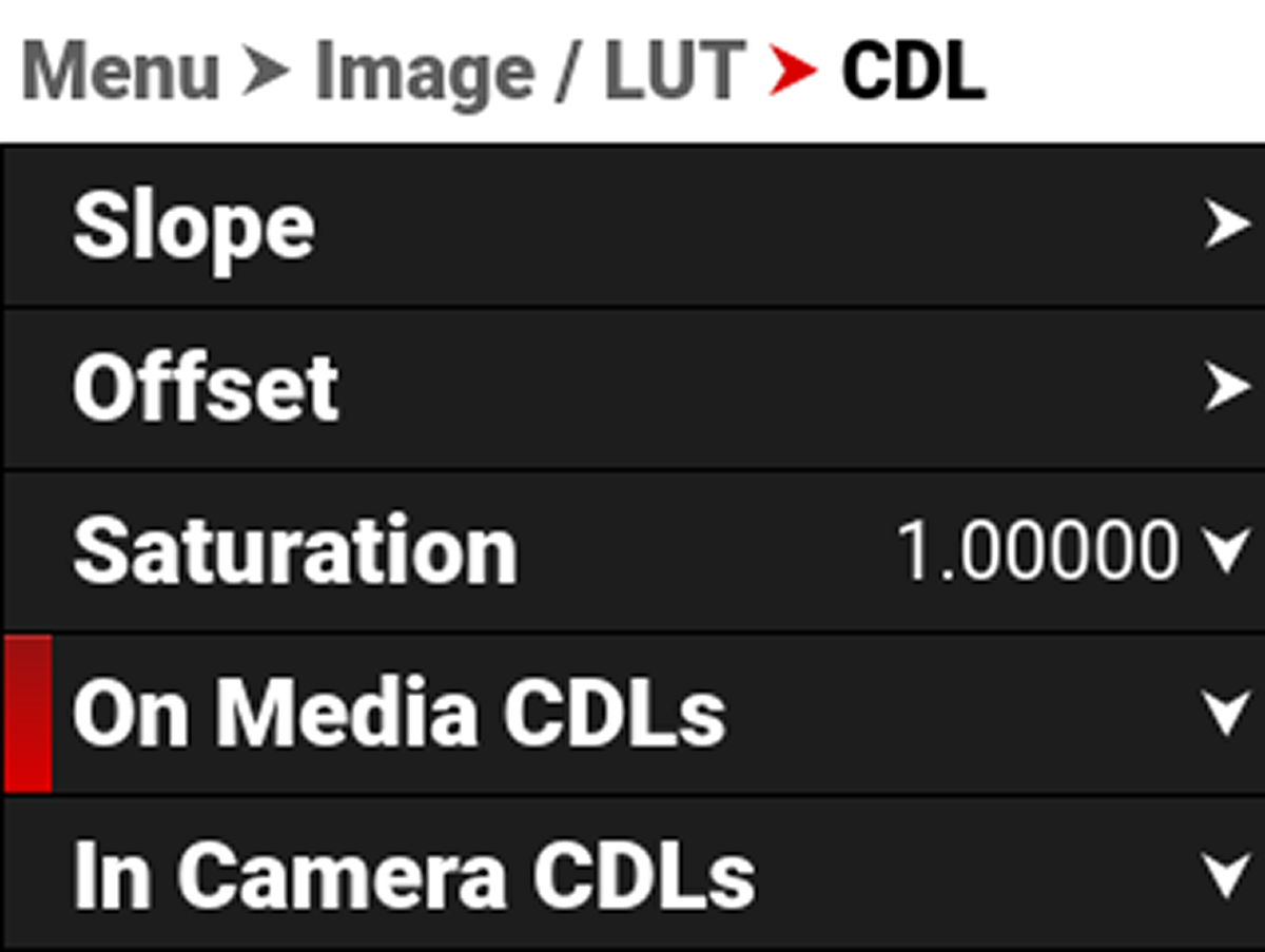 CDLs can be imported from media to the camera. When importing CDLs from media to the camera, the CDLs are saved to a folder on the camera called "cdls."