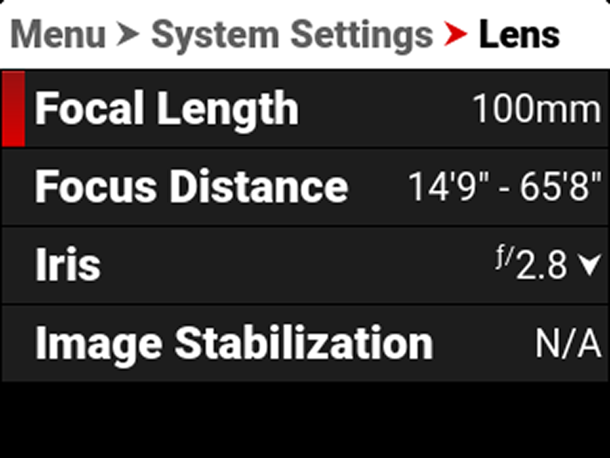 Use the Iris menu to select the camera lens f-stop. Press the button below Edit to open the keypad and enter the f-stop manually.
